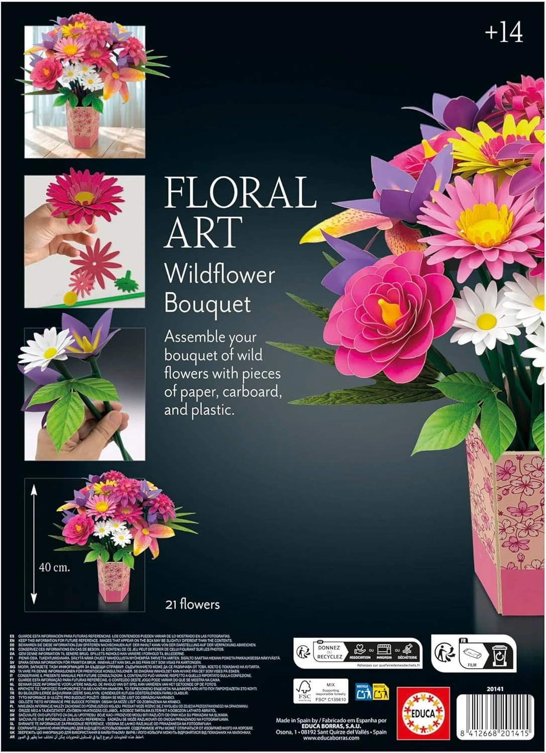 Il set EDUCA Floral Art trasforma i momenti di tranquillità in un'esperienza creativa. Grazie ai pezzi pretagliati e alle istruzioni intuitive, assemblerai facilmente un bouquet realistico, perfetto per qualsiasi interno. Scegli tra sei motivi floreali e crea una composizione personale che non appassisce.