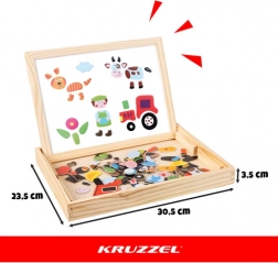 La creativa lavagna KRUZZEL a doppia faccia per bambini dai 3 anni unisce il lato magnetico bianco per comporre forme e scrivere con pennarello al lato a gesso nero per disegnare. Nella confezione ci sono 108 pezzi magnetici colorati, un pennarello a secco, gessetti, una spugnetta e una pratica scatola in legno per riporre tutto. Uno strumento perfetto per sviluppare motricità fine, pensiero logico e creatività senza schermi.
