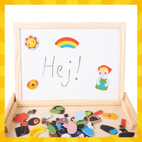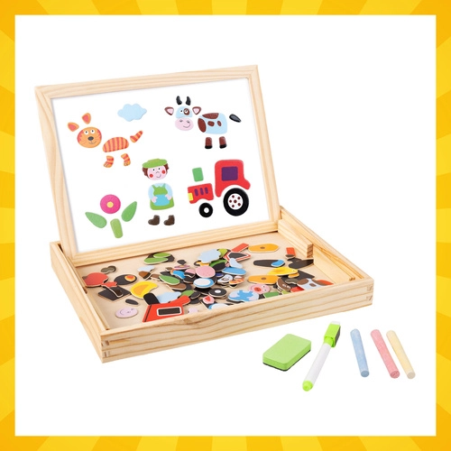 Scopri un gioco intelligente che cresce con il tuo bambino. La lavagna a doppia faccia offre due mondi di divertimento: lato bianco magnetico per comporre animaletti, personaggi e veicoli e per scrivere con il pennarello a secco, e lato nero a gesso per il disegno libero. Il tutto riposto in una compatta scatola in legno che funge anche da supporto.