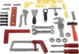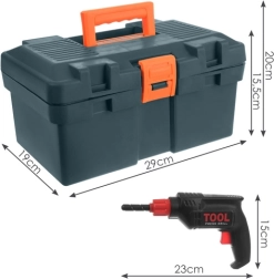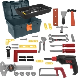 Contenuto del set: valigetta, martello, cacciavite a taglio e a croce, sega a mano mobile, chiave a occhiello, chiave regolabile, chiave aperta, chiave a bussola, calibro a corsoio, livella, quadra, spatola, lima, elementi di fissaggio, listelli, viti e dadi. Il trapano ha una punta rotante senza bisogno di batterie, per un gioco fluido e intuitivo.