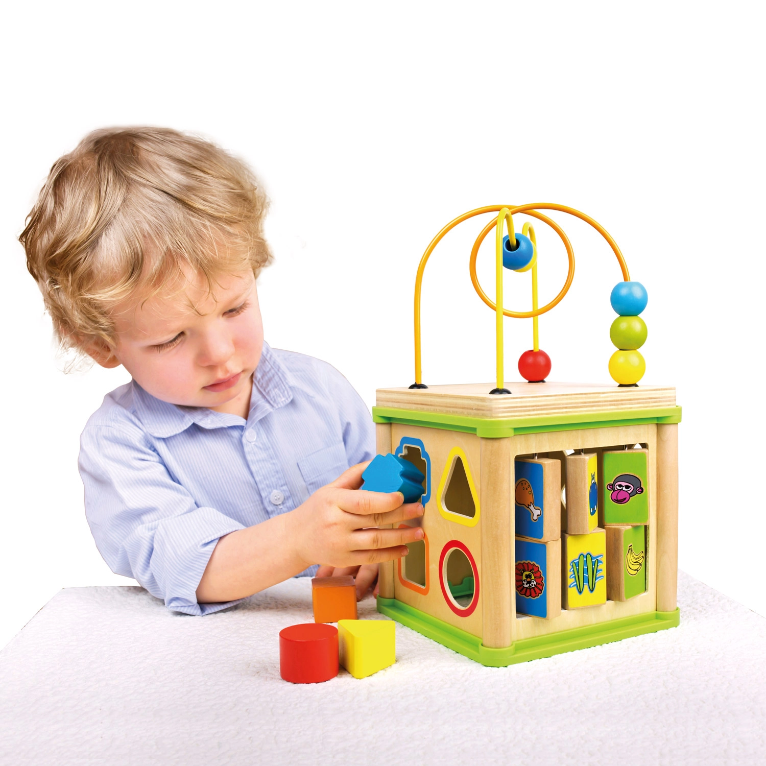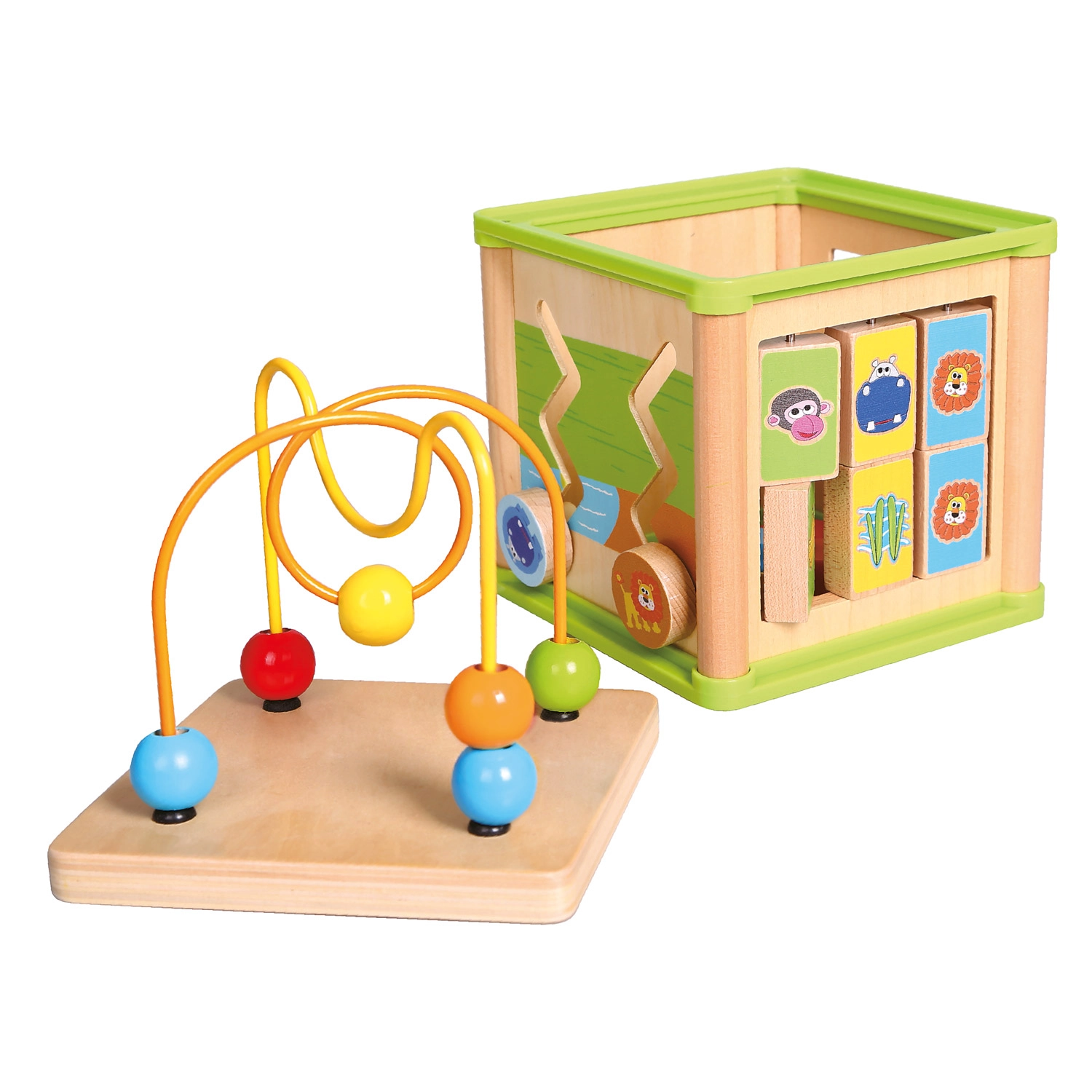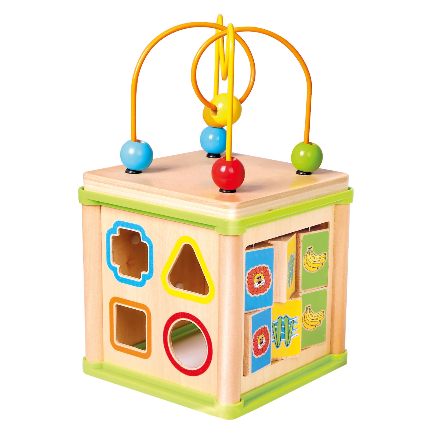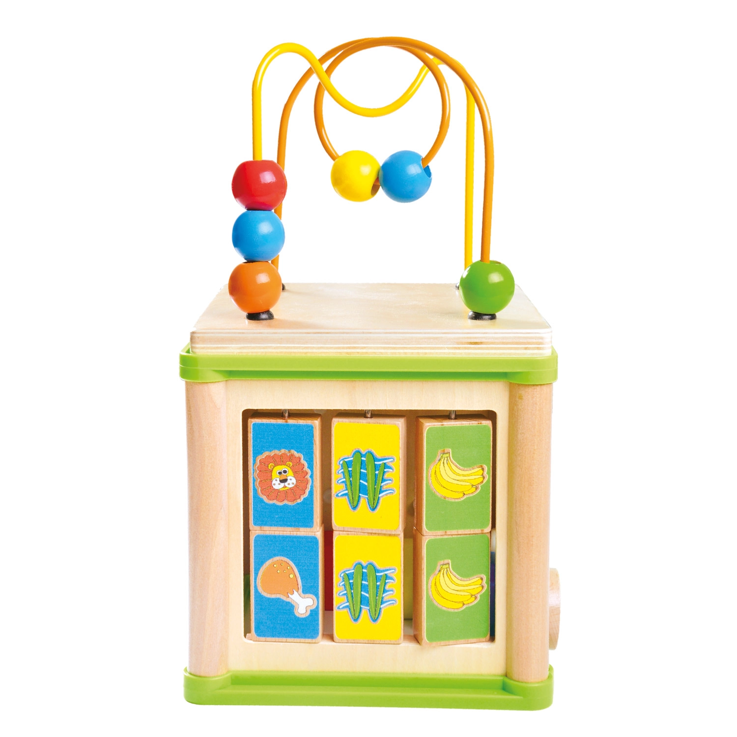 Questo versatile cubo attivo in legno combina cinque attraenti elementi di gioco in un formato compatto. I bambini possono abbinare gli animali al loro cibo, far scorrere le perline lungo piste tortuose, esplorare la funzione degli ingranaggi o allenarsi con l’incastro delle forme. La parte superiore è un labirinto con perline che sostiene la coordinazione mano-occhio e la concentrazione.