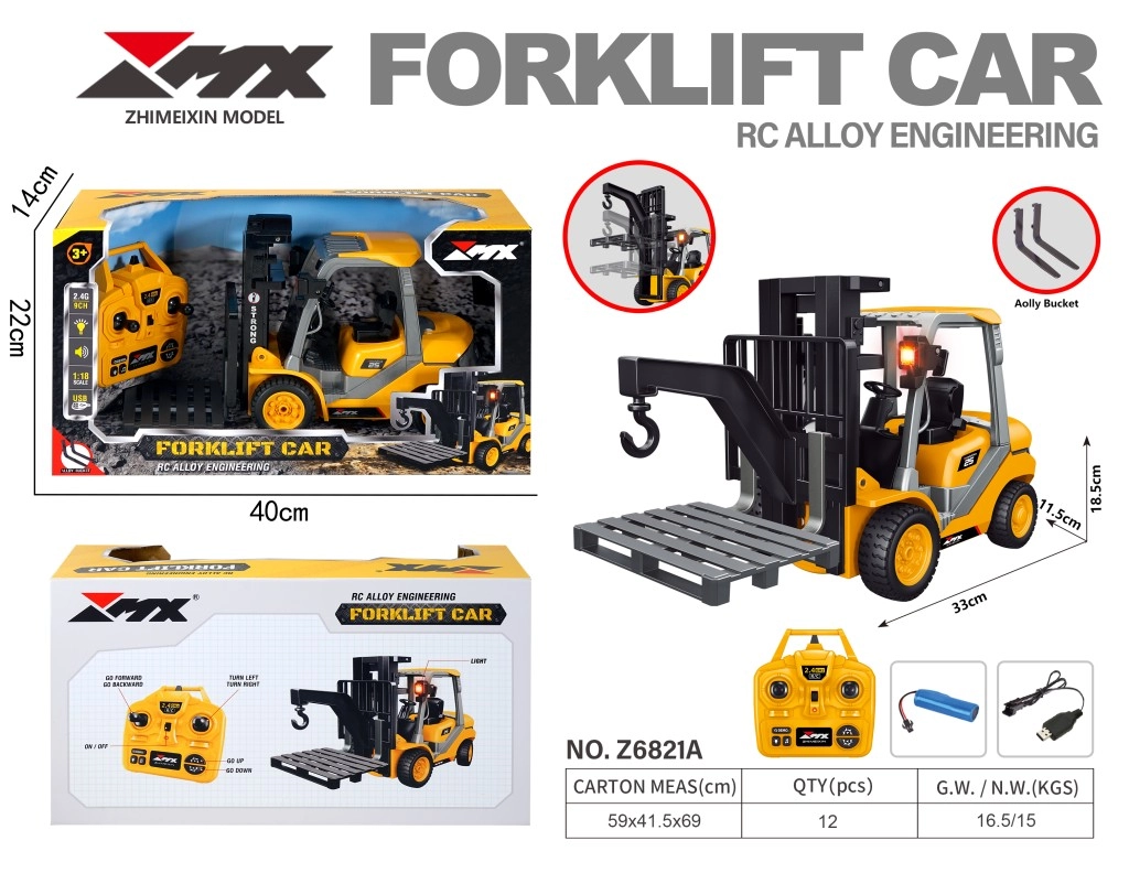 Il radiocomando ergonomico a 9 canali consente marcia avanti/indietro, sterzata a sinistra/destra e controllo preciso del sollevamento delle forche. Le forche sono robuste e dotate di gancio per la movimentazione di diversi carichi. La modalità dimostrativa integrata mostra automaticamente i movimenti del modello: ideale per principianti e per una presentazione d’effetto in vetrina.