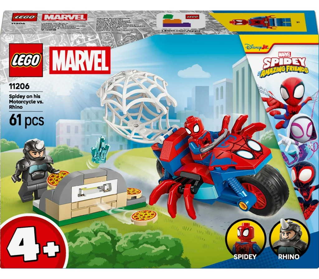 Entra nel mondo d'azione dei supereroi con il set LEGO per bambini dai 4 anni, dove SPIDEY sulla sua moto ragnatela affronta il cattivo RHINO. Ti aspettano costruzioni facili con 61 pezzi, due minifigure, una fantastica moto con ragnatela e un divertente forno per la pizza per storie fantasiose. Regalo ideale per i piccoli fan MARVEL e della serie “Spidey e i suoi fantastici amici”.