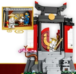 Costruisci un suggestivo monastero con elementi architettonici rosso-neri, cancello apribile con anello dorato, scalinata decorata e sakura in fiore. Il set include anche una lanterna in pietra e una sala da tè con adesivi che ritraggono scene celebri della serie, per un’esposizione autentica che rende omaggio alla storia di NINJAGO.