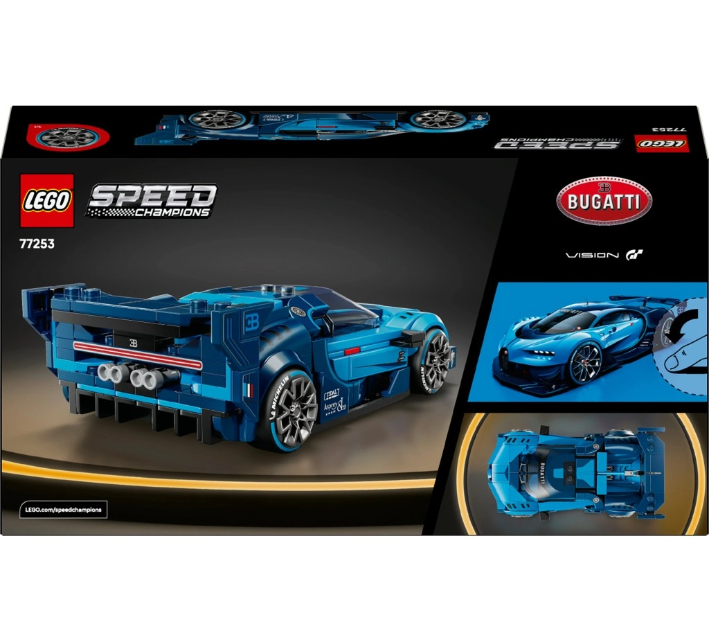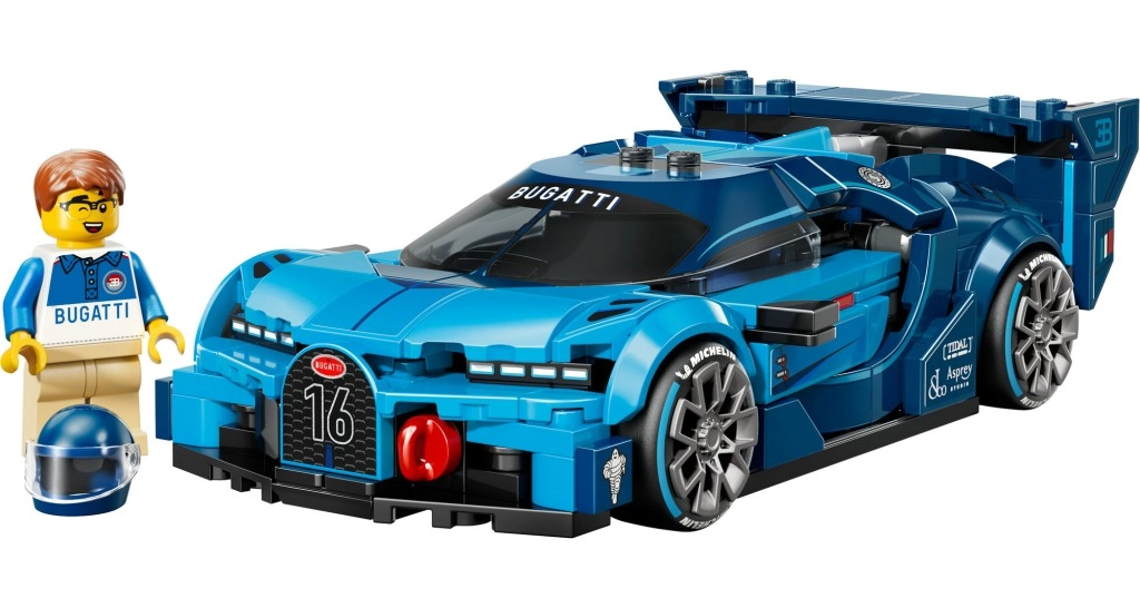 Vivi l’adrenalina dei campionati con il modello BUGATTI Vision GT, che colpisce per la forma precisa della carrozzeria, la griglia anteriore a ferro di cavallo con il numero 16, gli otto fari, la pinna sul tetto e il vistoso alettone posteriore. Gli pneumatici larghi con stampa conferiscono all’auto un look da corsa realistico e la minifigure del pilota con abbigliamento brandizzato BUGATTI si inserisce comodamente nell’abitacolo.