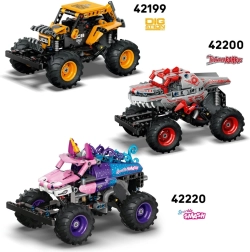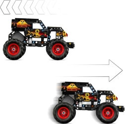 Questo modello della linea LEGO Technic cattura fedelmente l’atmosfera dell’arena Monster Jam. Un lato del veicolo sfoggia motivi infuocati con cerchi rossi, l’altro è declinato in azzurro ghiaccio con ruote blu. Grazie al motore a retrocarica basta tirare all’indietro e il truck schizza in avanti per salti, drift e trick spettacolari – tutto senza batterie.