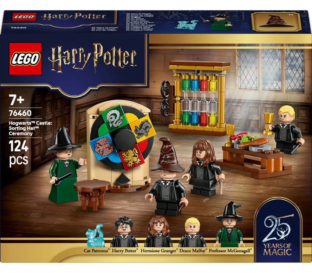 Rivivi l’iconico momento del film La Pietra Filosofale con questo set LEGO Harry Potter. Il set da 124 pezzi include la Sala Grande con tavolo rotondo, tavolo da banchetto e il Cappello Parlante funzionante con meccanismo girevole che decide la Casa. Non mancano 4 minifigure dettagliate – HARRY POTTER, HERMIONE GRANGER, DRACO MALFOY e la professoressa MCGONAGALL – e un esclusivo patronus a forma di gatto blu trasparente. Si combina alla perfezione con altri set LEGO Harry Potter, in particolare con la Sala Grande (76435).