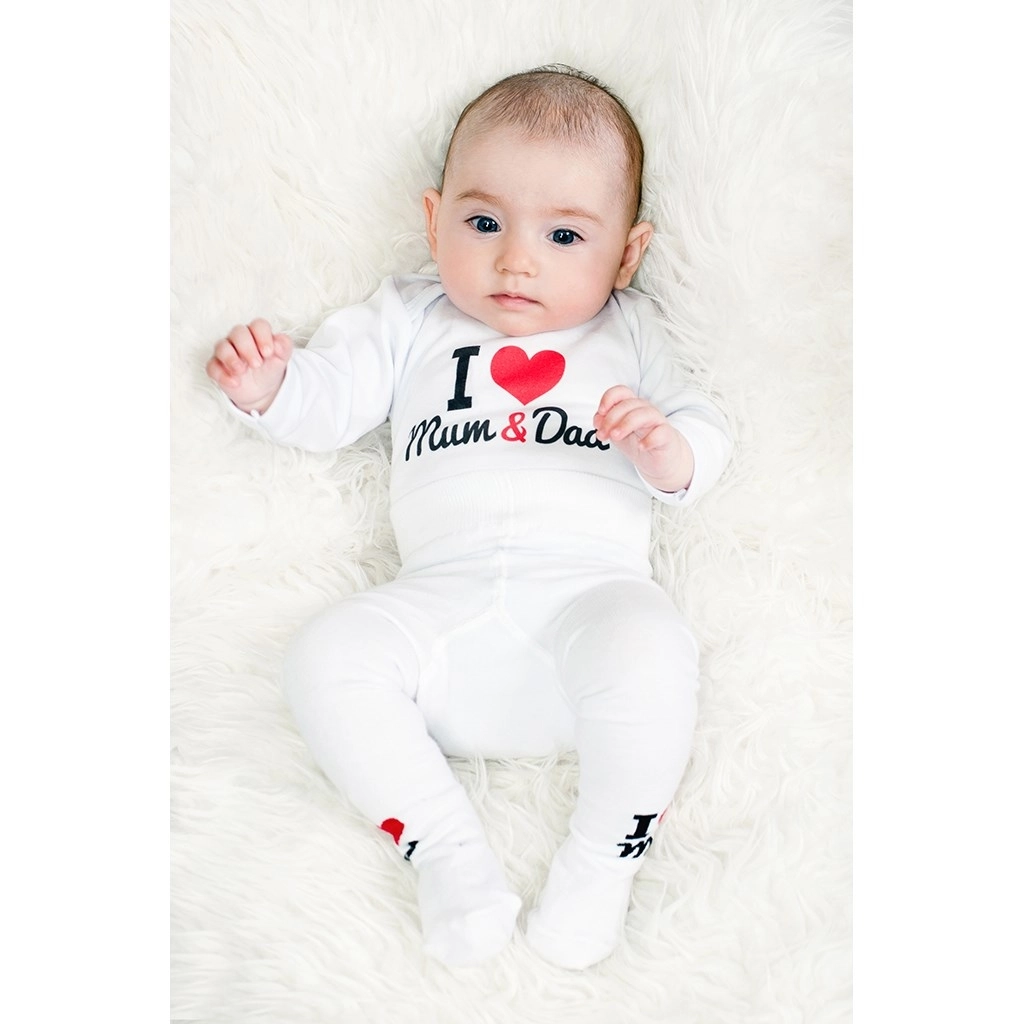 Adorabile body da neonato a manica lunga del marchio New Baby con stampa I Love Mum and Dad. Realizzato in 100% cotone per la delicata pelle del bambino, con comoda chiusura a bottoncini a pressione sulla spalla e tra le gambine. I colori certificati e sicuri garantiscono delicatezza per il neonato.