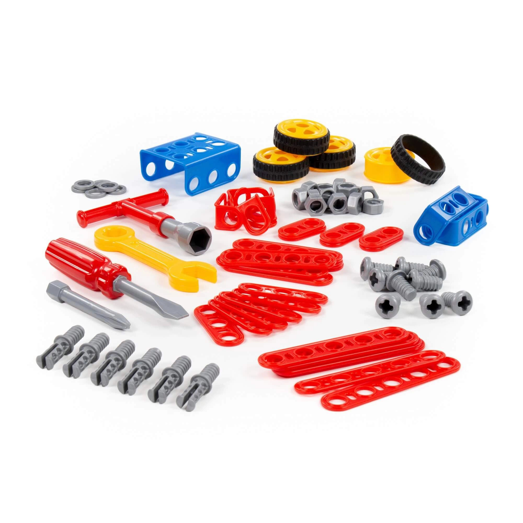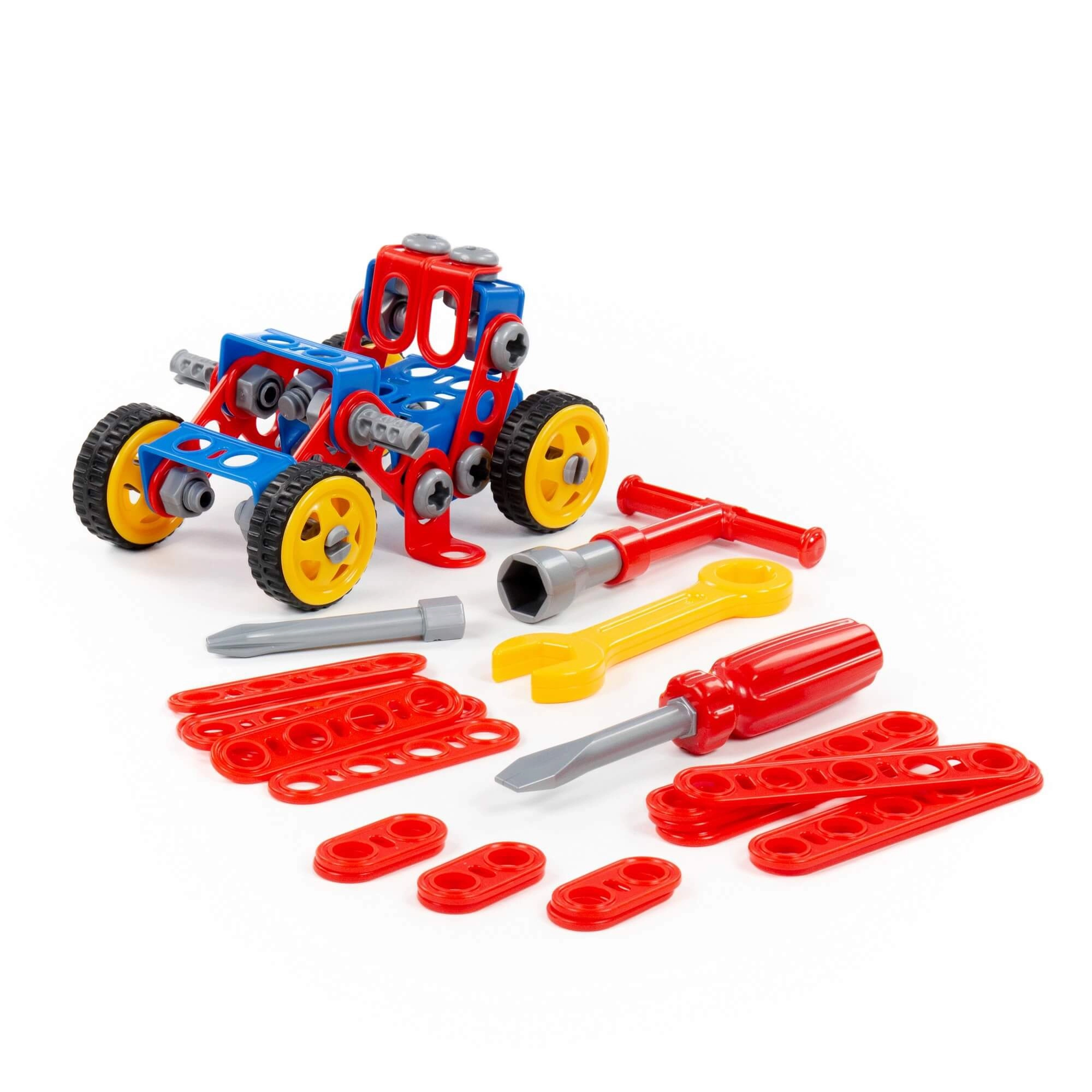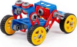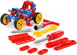 Il set include pratici attrezzi per bambini – cacciavite, chiave e altri accessori – grazie ai quali i piccoli imparano a serrare correttamente viti e dadi. Il gioco sviluppa il pensiero logico, la visione spaziale e la pazienza, sostenendo al contempo la creatività nella costruzione di vari veicoli.