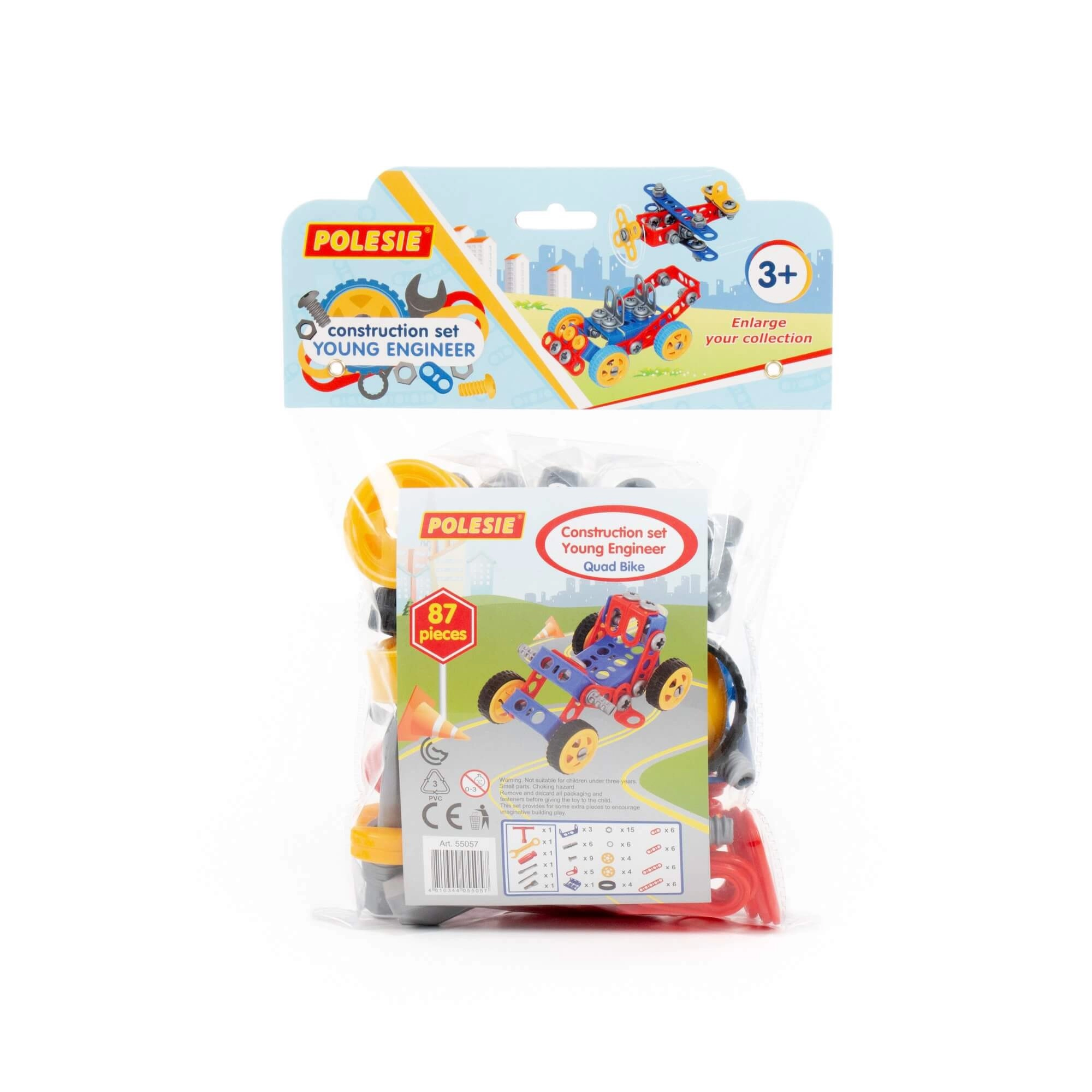 Costruzioni Piccolo Ingegnere 87 è un set di costruzioni colorato con cui i bambini possono assemblare un quad e altri modelli secondo la propria fantasia. Le ruote con pneumatici in gomma dal diametro di circa 5,5 cm assicurano un movimento fluido e divertimento durante la guida. I pezzi hanno bordi arrotondati, si collegano facilmente e si smontano ripetutamente.