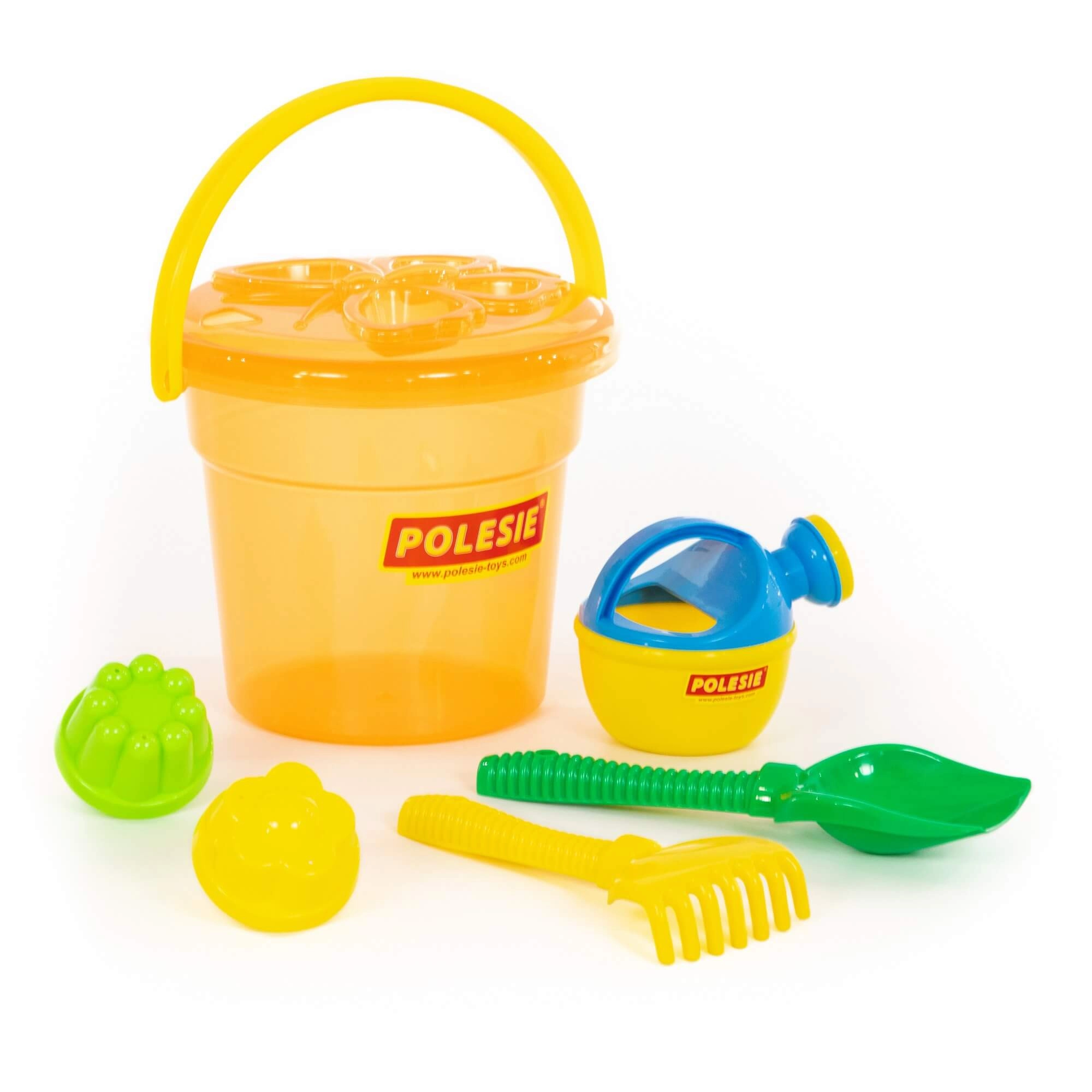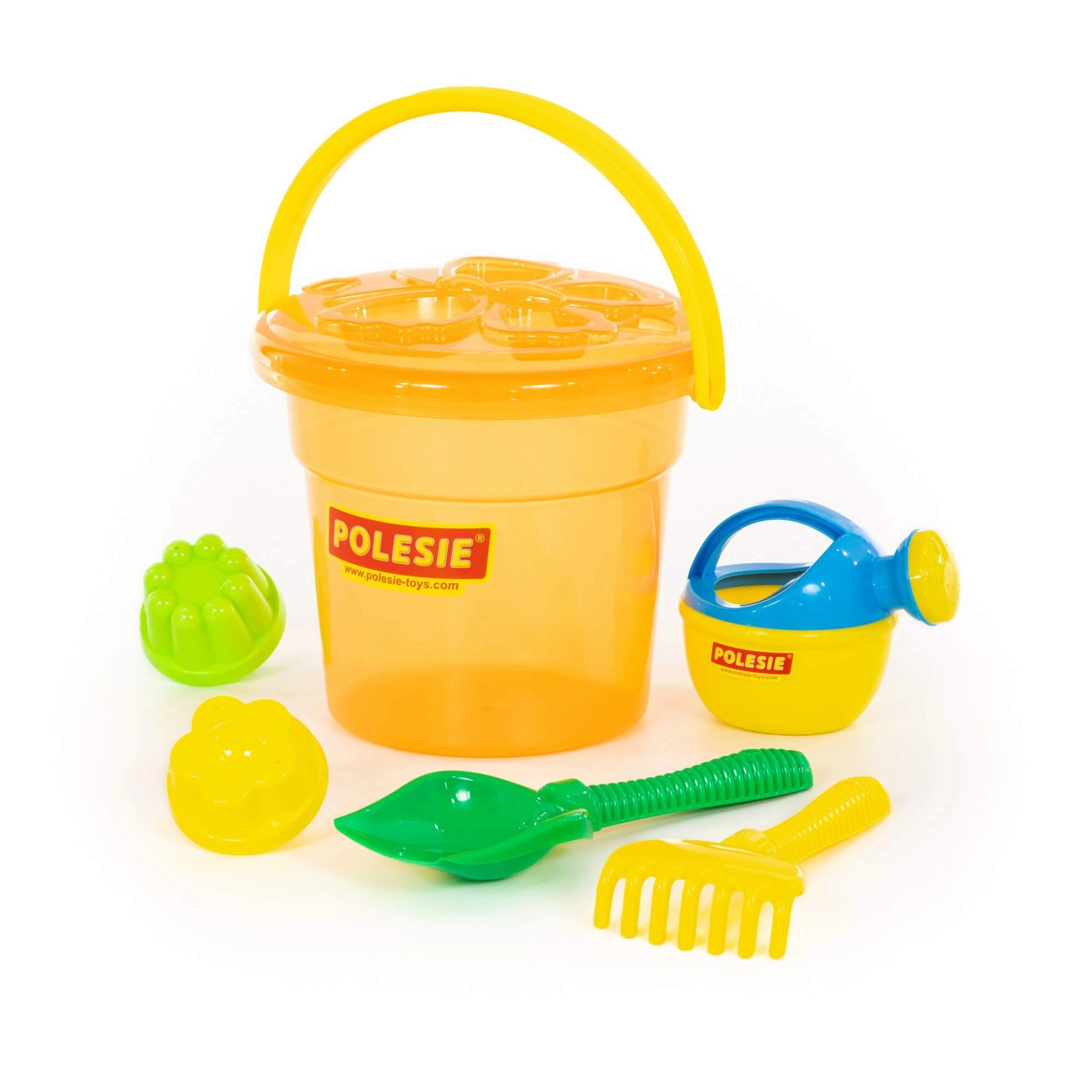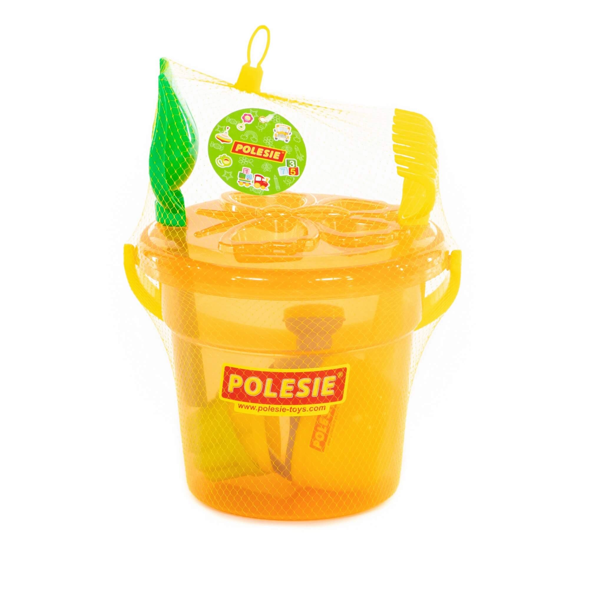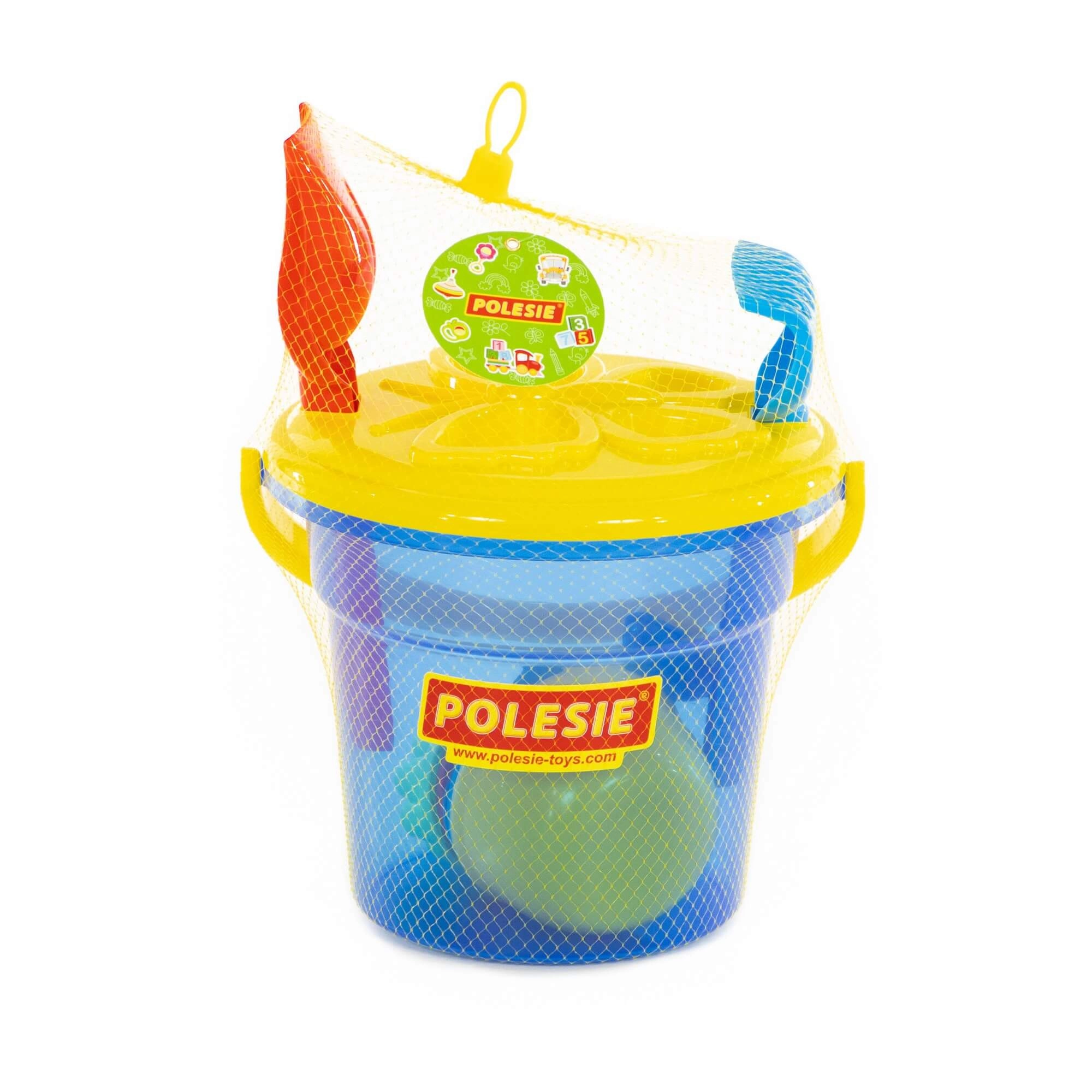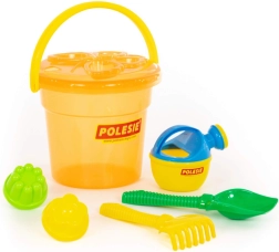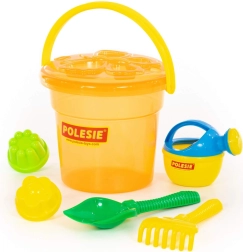 Il secchiello capiente contiene attrezzi e formine e si trasporta facilmente in spiaggia o al parco giochi.