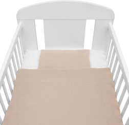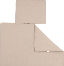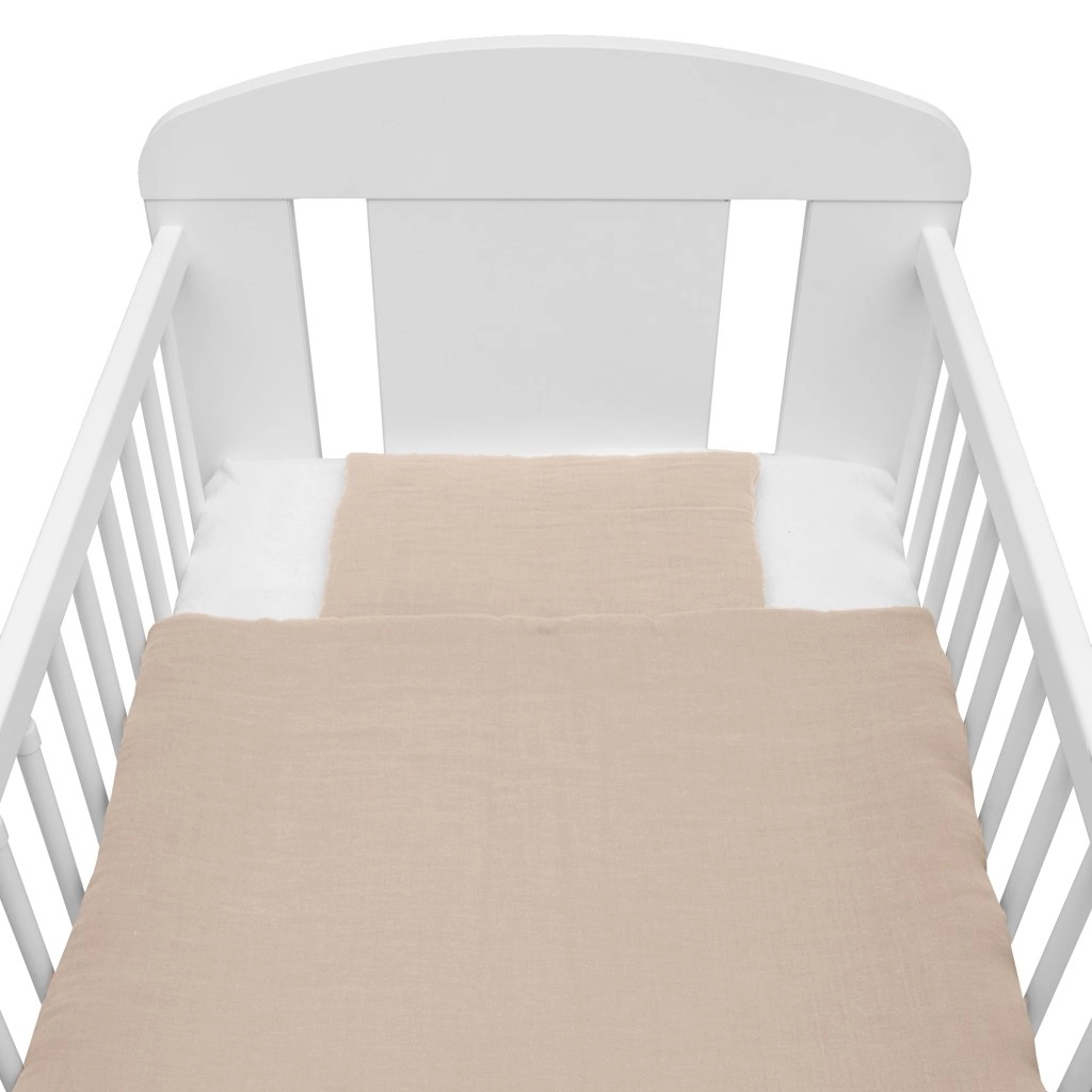 Questo set in mussola beige offre comfort al bambino fin dai primi giorni di vita. La struttura leggera e ariosa della mussola garantisce ottima circolazione dell’aria e riduce il rischio di surriscaldamento. L’imbottitura in fibre anallergiche è sicura e adatta anche ai bambini più sensibili.