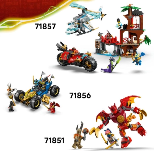 Le scene di gioco sono arricchite da un piccolo modello di albero con pianta girevole che nasconde una spada d’oro e da una tuta robotica con cockpit per minifigure per scontri epici. Nella confezione trovi 8 minifigure: i ninja Zane, Sora, Arin, le versioni drago di Lloyd e Cole e tre avversari – il mostro acido, il mostro della terra e la leader dei lealisti. Ogni personaggio ha equipaggiamento e dettagli unici per storie ricche e coinvolgenti.