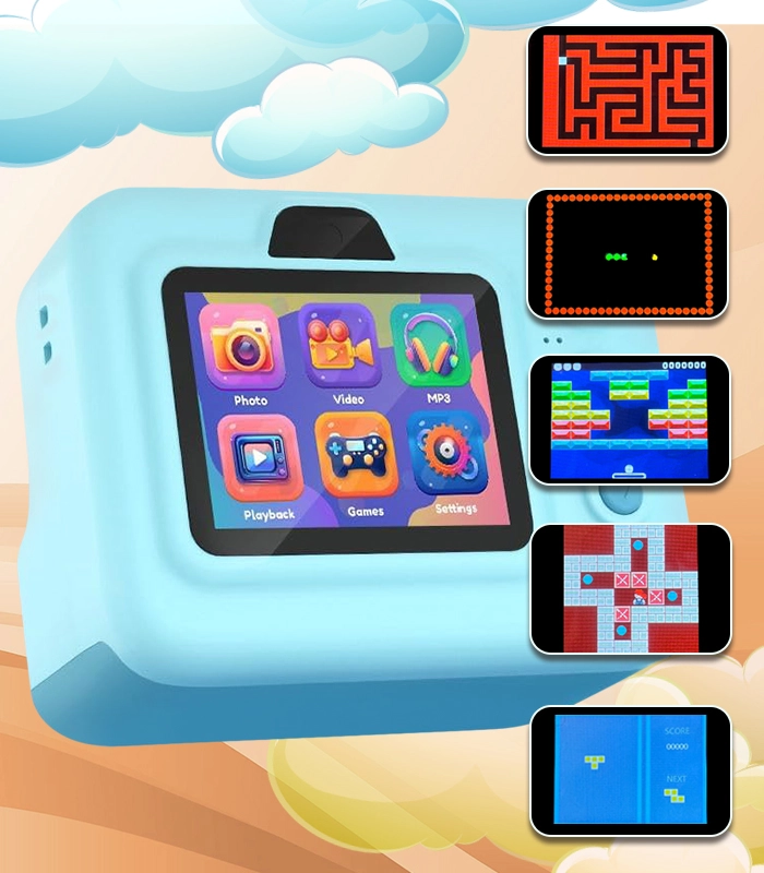 La fotocamera combina fotografia, video 1080P e mini‑giochi (rompicapi, snake, flipper, sokoban) per divertimento e sviluppo della creatività. Il luminoso schermo da 2,4" e i comandi intuitivi facilitano ai bambini la visualizzazione e la gestione di foto e video. Il supporto di schede di memoria microSD fino a 32 GB offre spazio sufficiente per i ricordi.