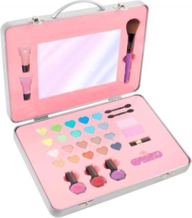 Scopri il set cosmetico in un'elegante valigetta, piena di trucchi, smalti per unghie e altri accessori per una perfetta cura di unghie e labbra, ideale per ragazze dagli 8 anni in su.