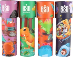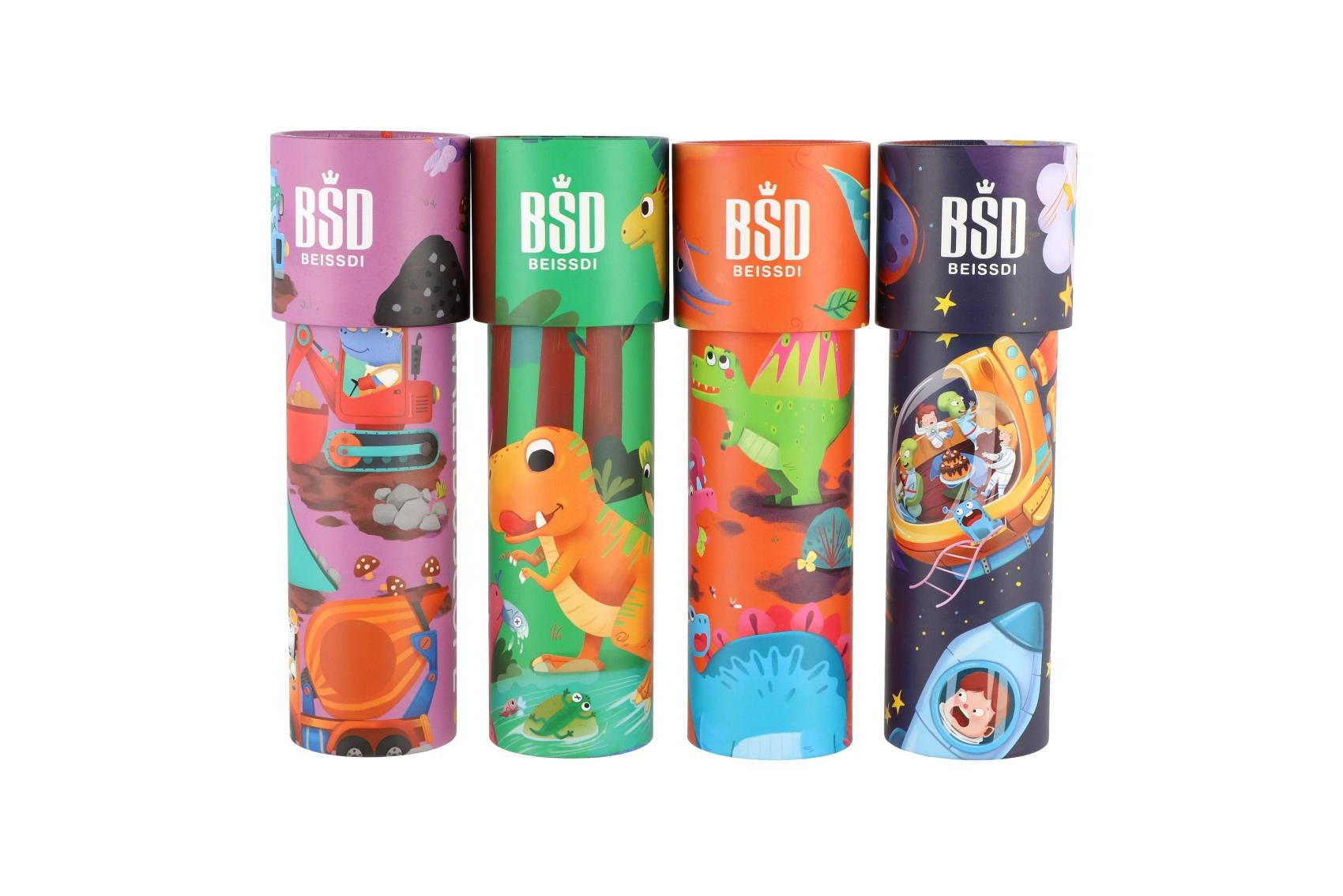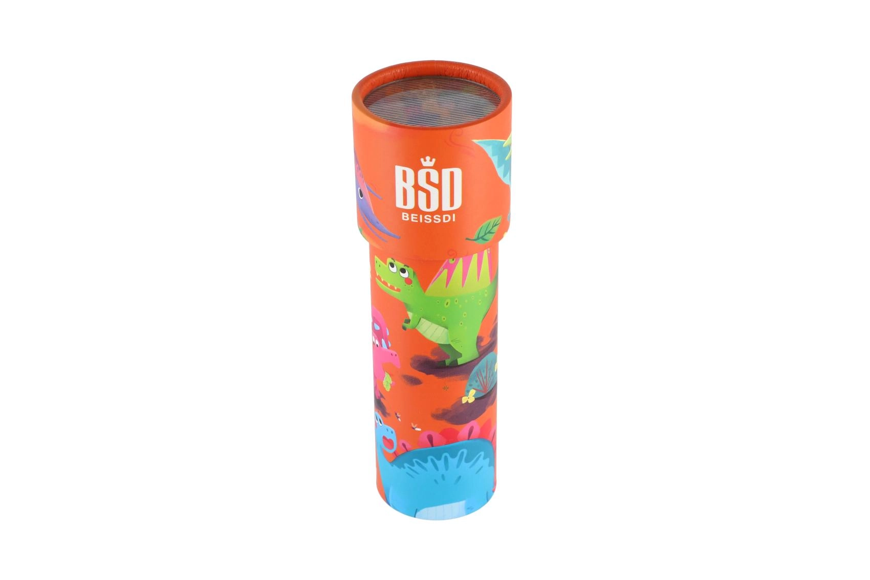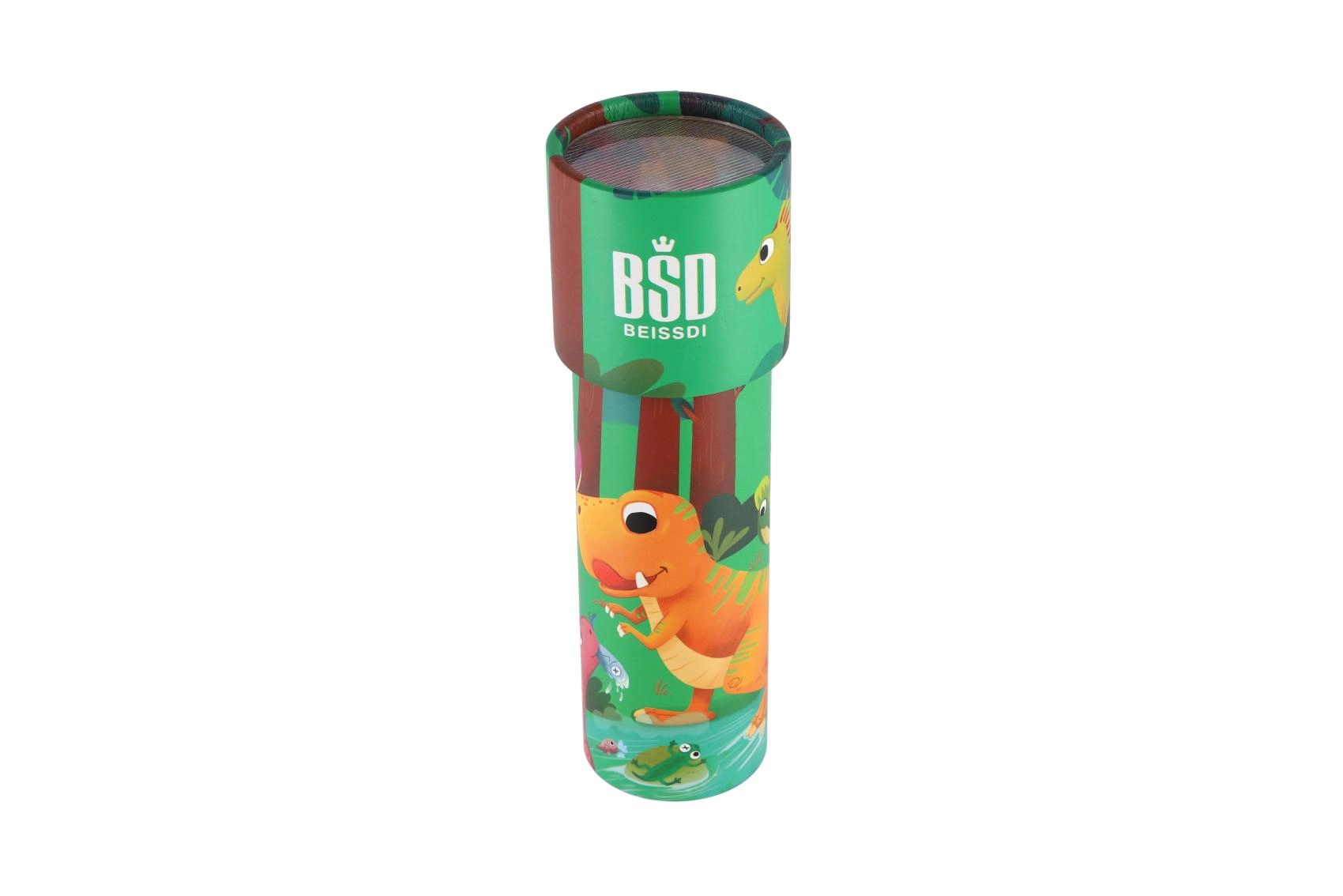 Illustrazioni divertenti di dinosauri stimolano la fantasia dei bambini e rendono il caleidoscopio un piccolo regalo accattivante.
