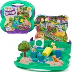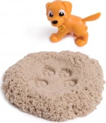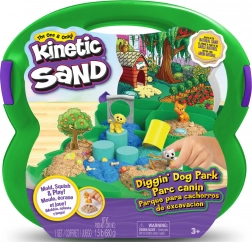 Il set include tre colori di sabbia (naturale, nera e verde), 3 figurine di cagnolini, rullino-stampino, utensile per modellare e scenografie in cartone del parco. I bambini possono mescolare i colori, creare impronte di zampette, tunnel o sentieri e sviluppare fantasia e motricità fine.