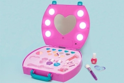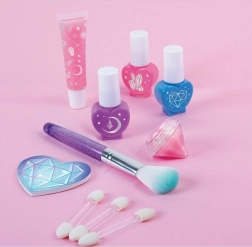 Contiene un astuccio per cosmetici con luce e specchio, 12 ombretti di diversi colori, 3 pennelli per ombretto, 2 blush, un pennello per blush, 3 smalti per unghie di diversi colori, lucidalabbra, balsamo per labbra, lima per unghie e istruzioni. Adatto a bambini dagli 8 anni.