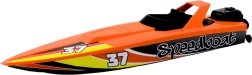 Il camion arancione dettagliato con rimorchio e rampa di carico consente un facile carico della barca e un trasporto fedele verso le gare.
