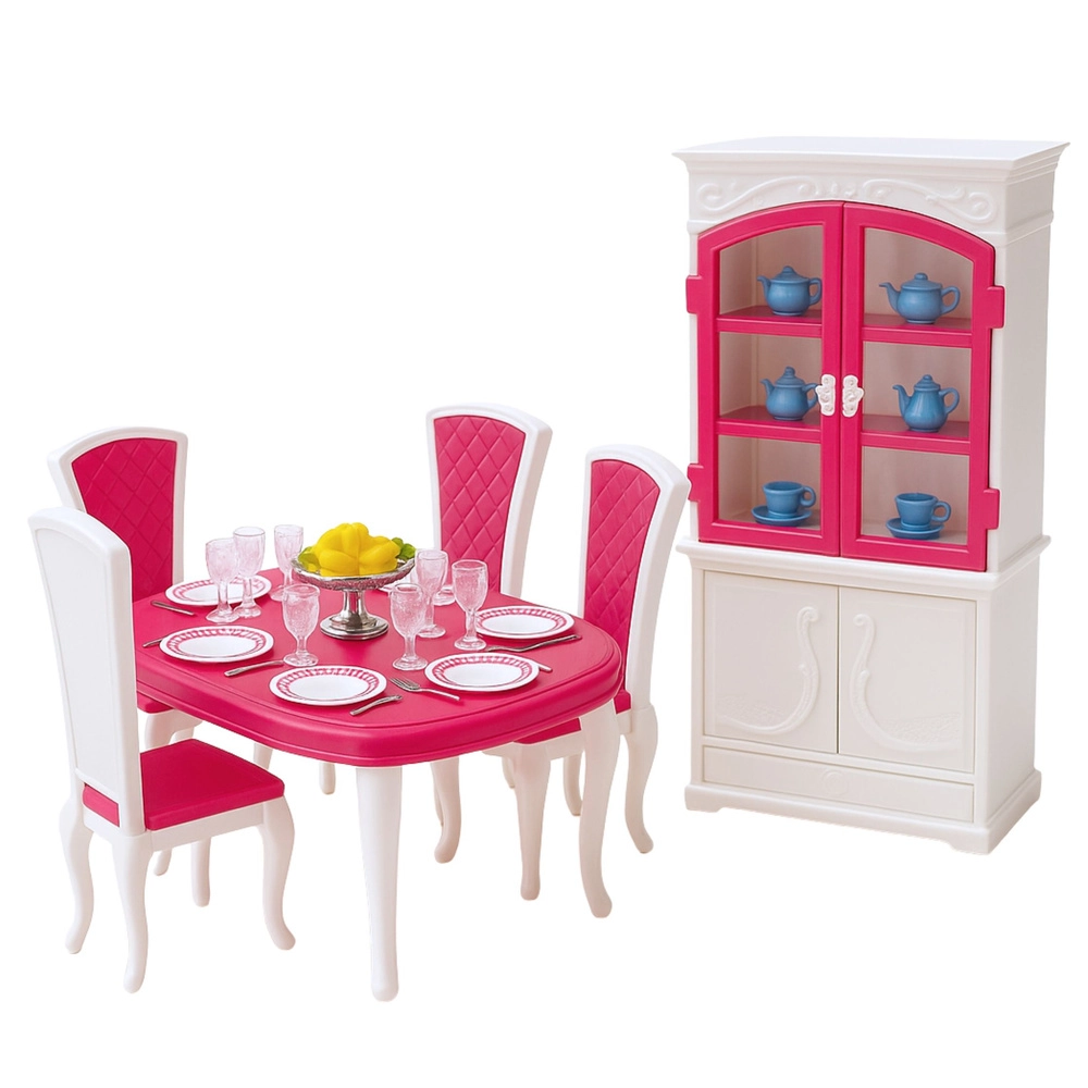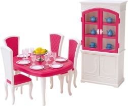 Elegante set di mobili e accessori per bambole di circa 29 cm che trasforma ogni casetta in una sala da pranzo realistica. Include un tavolo, sedie, una credenza con sportelli apribili e una ricca dotazione da tavola. Realizzazione in plastica resistente, colorazione rosa‑bianca e stile classico che favoriscono il gioco creativo, lo sviluppo delle competenze sociali e delle scene di role‑play. Conforme agli standard CE ed EN71.