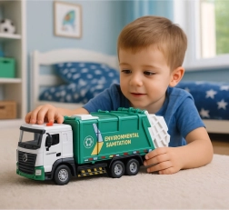 Il realistico camion dei rifiuti entusiasmerà i piccoli appassionati di tecnologia e dei servizi urbani. Dispone di una robusta cabina in metallo, porte apribili e un cestello sollevabile come nei veri mezzi della nettezza urbana. Il divertimento è assicurato da effetti luminosi e sonori, subito pronti all’uso grazie alla batteria AG13 inclusa.
