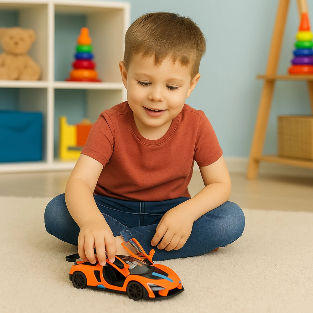 Il realistico mini modello di supersportiva spicca per il colore arancione intenso con dettagli blu e neri, grande alettone posteriore e linee aerodinamiche. La carrozzeria in metallo assicura maggiore resistenza nell’uso quotidiano, mentre le porte apribili aggiungono autenticità e invitano a dare uno sguardo agli interni.