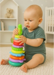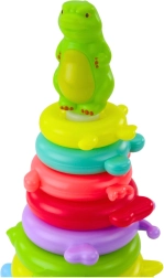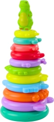 Questo gioco creativo impilabile aiuta i bambini a classificare colori e dimensioni, sviluppando logica e pazienza. Il bambino impila gli anelli dal più grande al più piccolo e posiziona la figurina del dinosauro in cima: il risultato è una torre stabile e colorata.