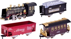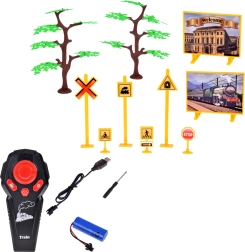 - locomotiva, carro carbone, carrozza passeggeri, carro merci, binari diritti e curvi, radiocomando RC 2,4 GHz, batteria, caricatore USB, boccetta per l’acqua