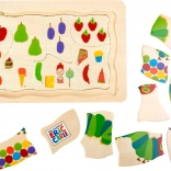 I motivi colorati della frutta e del bruco favoriscono il riconoscimento di forme e colori, allenano la coordinazione occhio–mano e migliorano la concentrazione.
