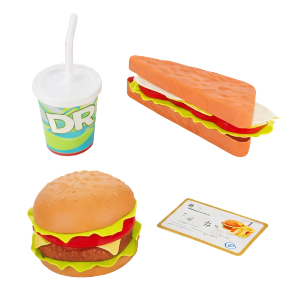 Hamburger, baguette e bevanda completano lo scenario del ristorante. I bambini possono ordinare, servire e pagare – un’esperienza completa di fast food.