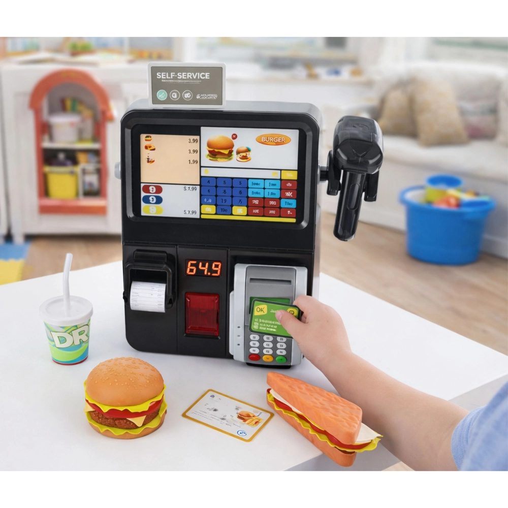 Questa cassa self-service per bambini è ideale per piccoli commessi e cuochi. Funzioni realistiche – dalla scansione alla stampa degli scontrini fino al pagamento con carta – creano un’atmosfera autentica di negozio o fast food. Grazie agli effetti luminosi e sonori, il gioco è dinamico e coinvolgente.