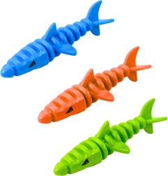 Il set include uno squalo blu, uno verde e uno arancione: i colori brillanti facilitano la ricerca sott’acqua e rendono il gioco più chiaro.