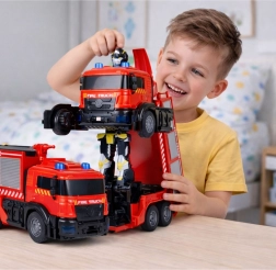 Scopri il divertimento d’azione con l’autopompa RC che con un solo tocco si trasforma in un imponente robot. Grazie al radiocomando, guida e trasformazione sono fluide e intuitive. La realistica sirena, i LED blu e il cannone ad acqua funzionante con serbatoio rendono ogni missione autentica.
