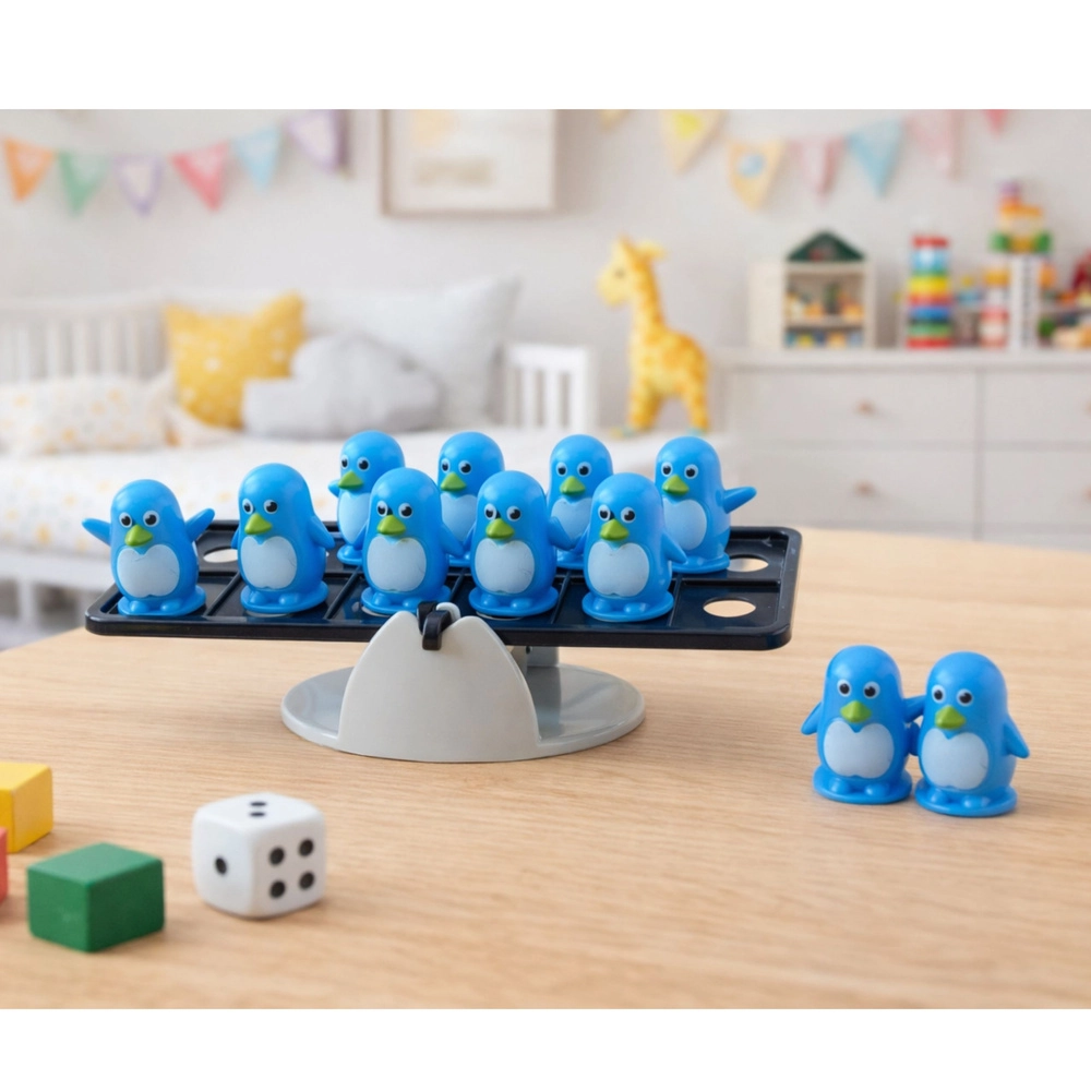 Divertente gioco educativo di equilibrio con pinguini blu che sviluppa il pensiero logico, la concentrazione e la motricità fine. I bambini posizionano le pedine sulla base basculante in modo da mantenere la stabilità e allenare pazienza, calcolo e comprensione dei principi fisici.