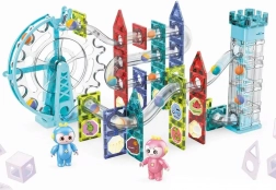 Costruisci per i bambini un mondo pieno di luci e movimento! Questa pista a biglie magnetica luminosa combina elementi di costruzione magnetici con una divertente pista a biglie, completata da una ruota gigante elettrica, un ascensore per le biglie e illuminazione LED per uno spettacolo suggestivo al buio. Sviluppa creatività, motricità fine e favorisce sperimentazione nella costruzione di nuove strutture.