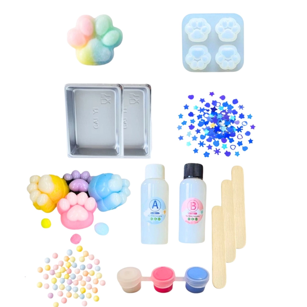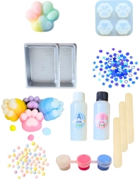 Contenuto della confezione: stampi a zampetta di gatto, gel per realizzare squishy, colori e coloranti, decorazioni, pennello e accessori ausiliari.