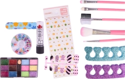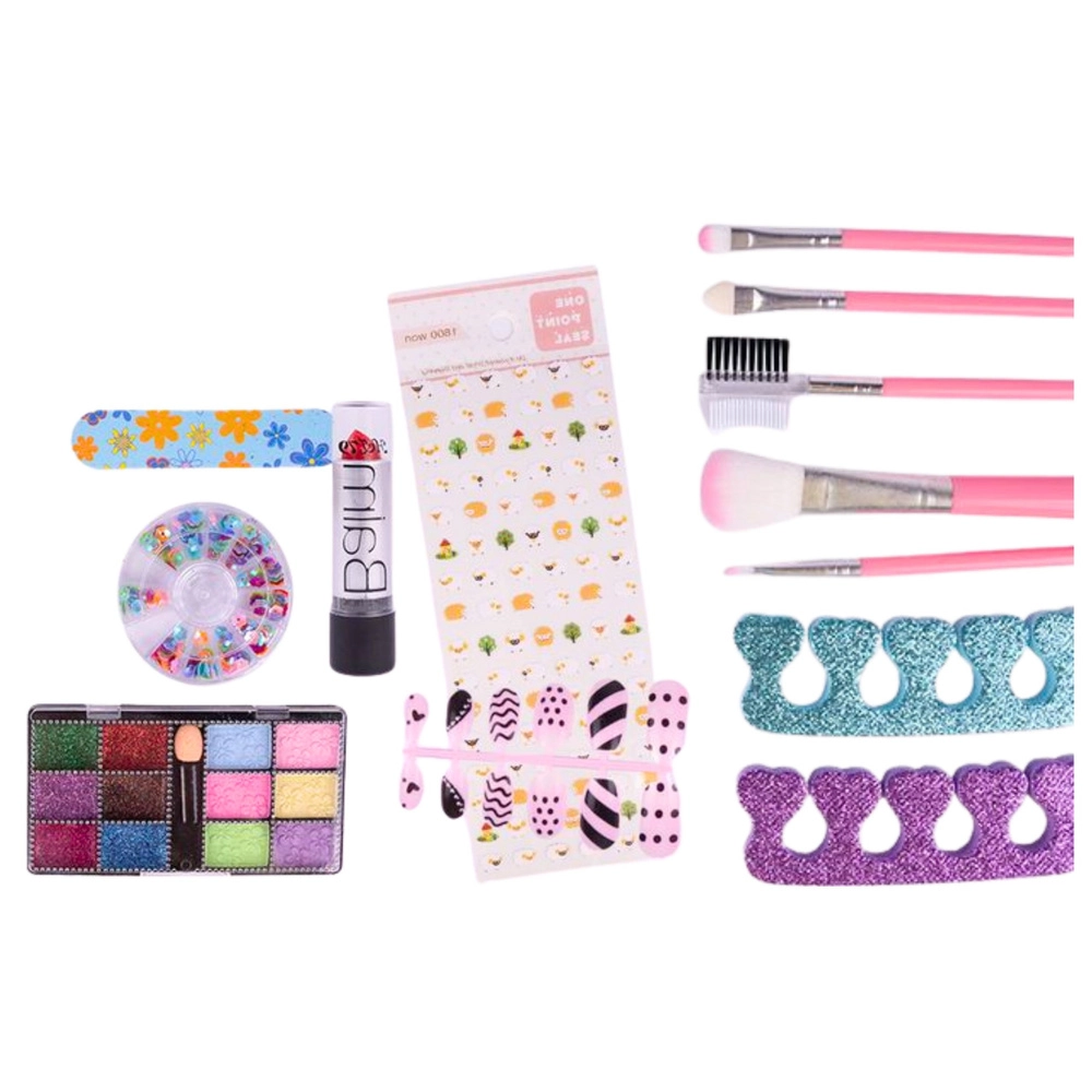 Palette di ombretti, rossetto giocattolo, pennelli, applicatori, decorazioni per unghie e separadita: un equipaggiamento ricco per un gioco sicuro e creativo.