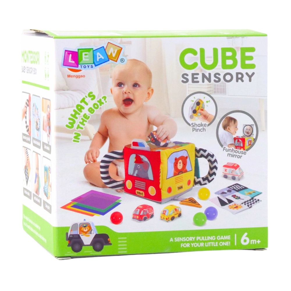 Colorato cubo sensoriale morbido per bambini dai 6 mesi che favorisce lo sviluppo dei sensi, la motricità fine e le abilità di coordinazione. Ogni lato offre attività diverse: elementi fruscianti, texture, intagli, un specchietto sicuro, nastrini estraibili e morbide macchinine e palline. Il tema auto e segnali stradali stimola la curiosità e insegna le prime connessioni in modo divertente.