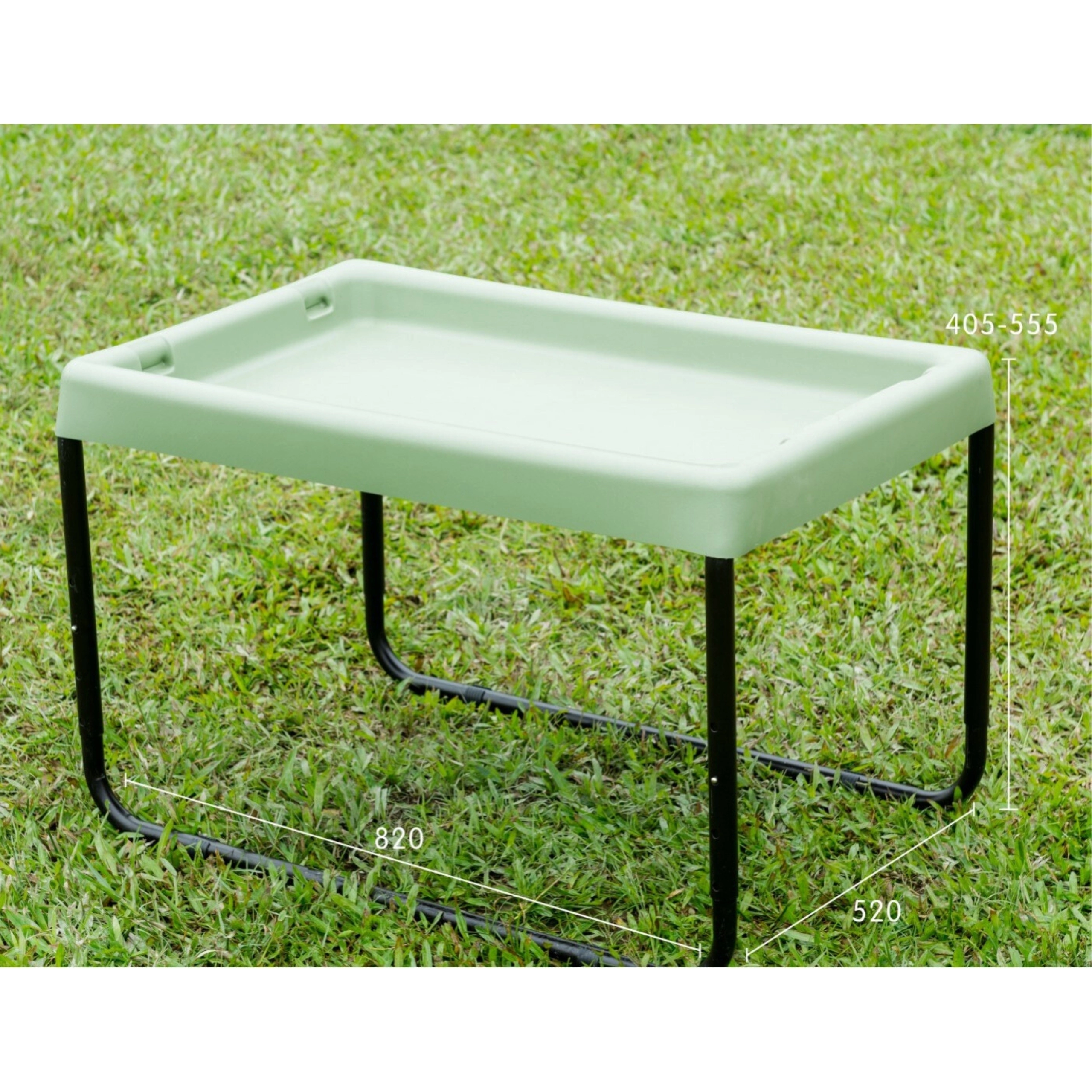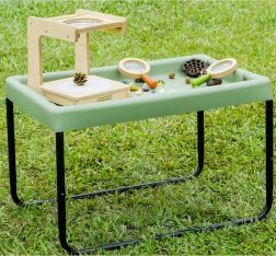 La vaschetta in plastica, leggera ma robusta, su telaio tubolare in acciaio, affronta senza problemi l’uso in asilo e le attività all’aperto. Il bordo rialzato aiuta a mantenere il materiale all’interno.