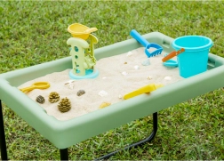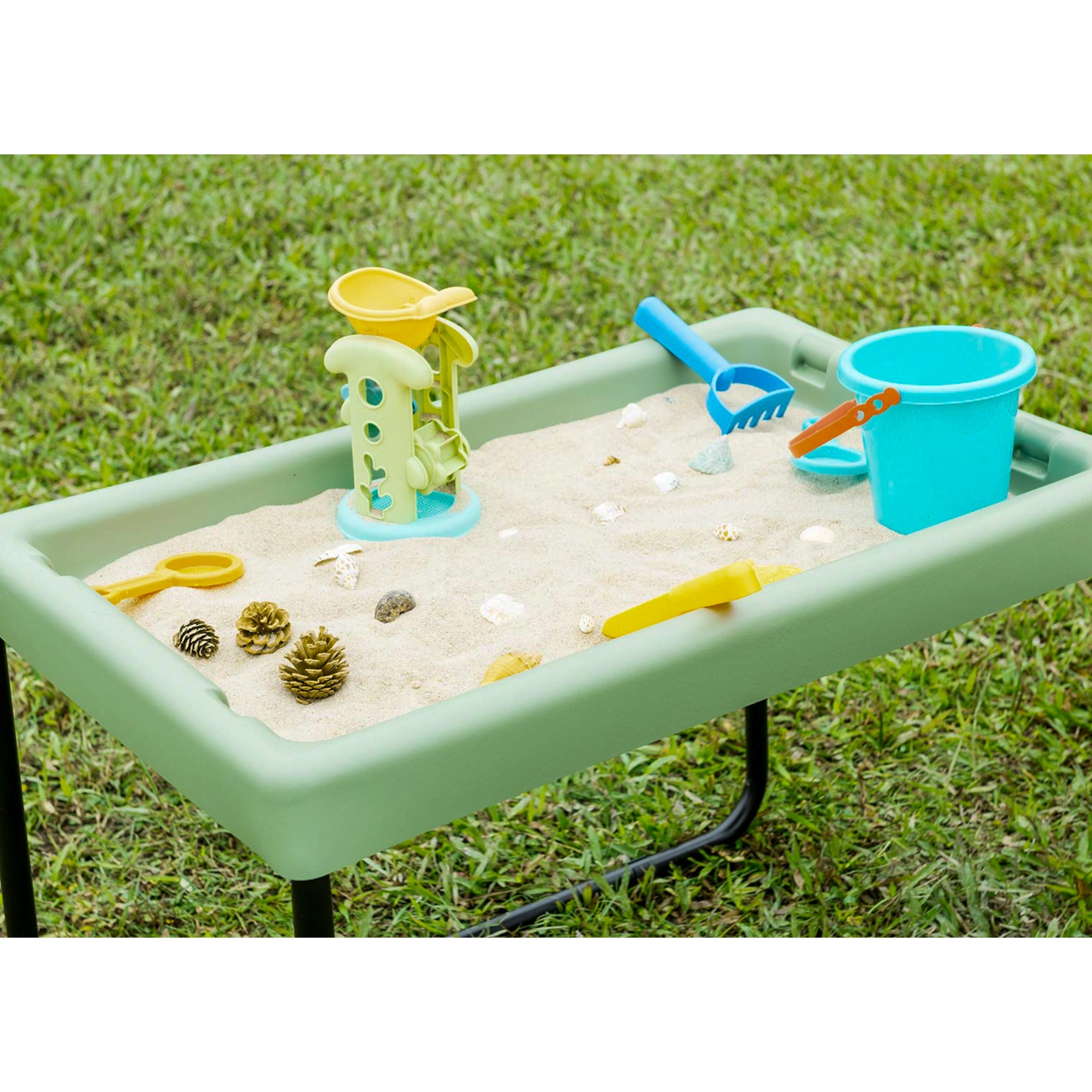 Il contenitore, sufficientemente capiente, accoglie sabbia, acqua e accessori per travasi, setacciatura ed esplorazione, sviluppando creatività, abilità senso-motorie e collaborazione tra i bambini.