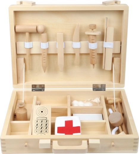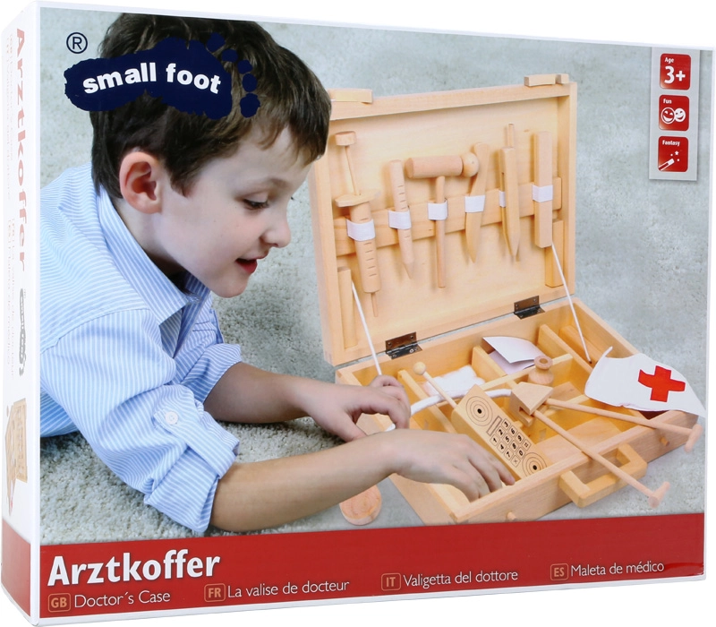 La valigetta da dottore in legno SMALL FOOT offre ai bambini un’esperienza autentica da ambulatorio. Nella raffinata valigetta in legno con classici simboli medici si trovano piccoli strumenti da dottore, un telefono giocattolo e siringhe – tutto sicuro per il gioco dei bambini. Grazie alla lavorazione di qualità e ai bordi levigati, il set è ideale per il gioco quotidiano.