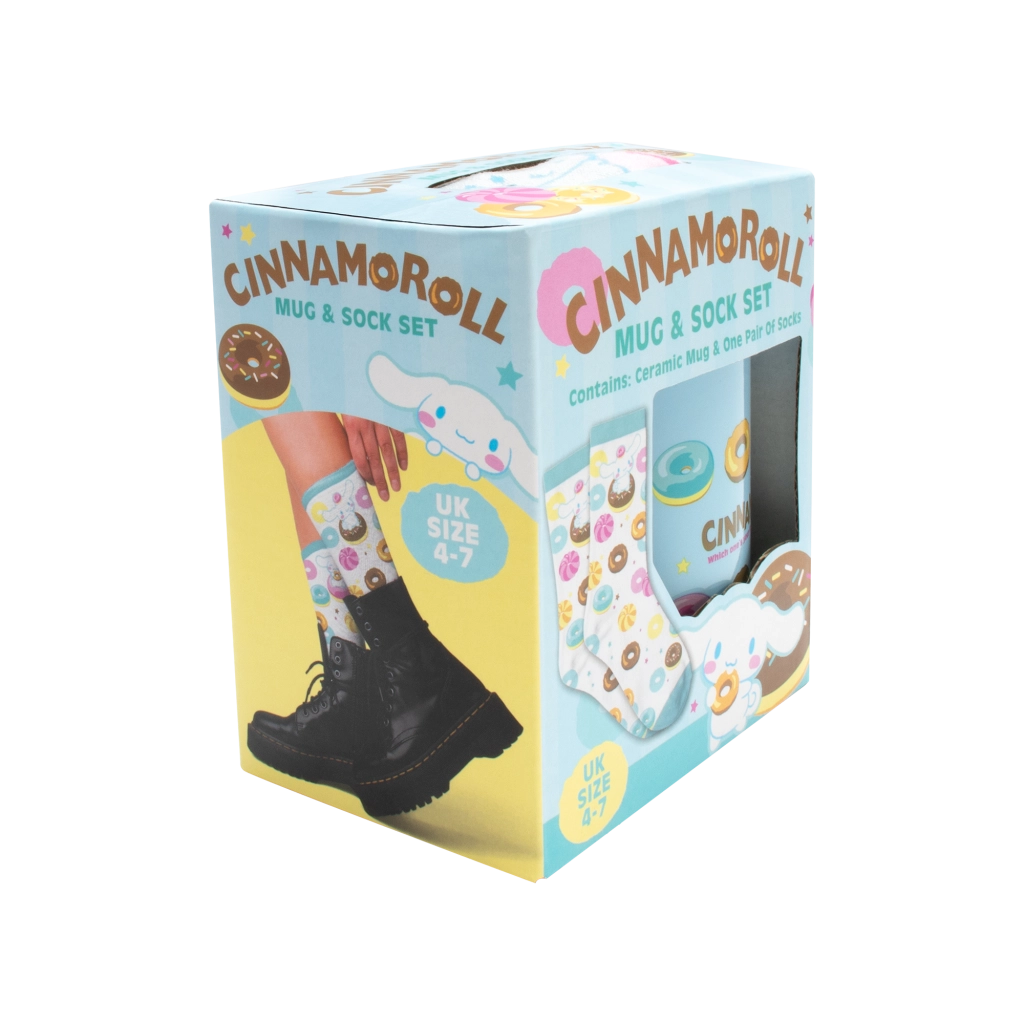 Questo incantevole set unisce una tazza pratica e calzini confortevoli in un design pastello coordinato con Cinnamoroll e donuts colorati. La tazza da 330 ml è adatta per caffè, tè e cioccolata calda, mentre i calzini piacevoli con bordo elastico scaldano e coccolano a ogni passo.
