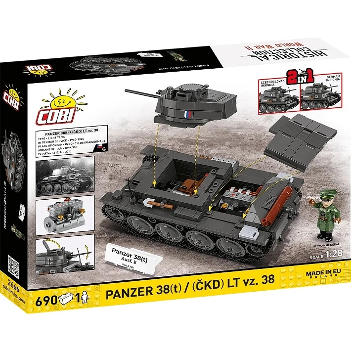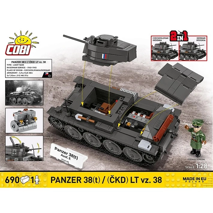 Costruisci l’iconico carro leggero in due versioni storiche con il set di alta qualità di COBI. Questo modello 2 in 1 permette di scegliere il LT vz. 38 cecoslovacco oppure la sua variante tedesca Panzer 38(t). Goditi i detagli in scala 1:28, cingoli realistici, botole apribili, cannone mobile e stampe durevoli. Inclusi anche una minifigure e una targhetta da collezione.