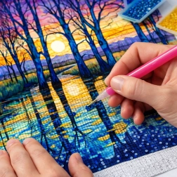 Crea il tuo quadro scintillante con la tecnica della pittura diamantata. Grazie alla tela prestampata e alla legenda chiara applicherai facilmente le pietruzze nei punti contrassegnati componendo passo dopo passo un mosaico con il motivo dettagliato delle betulle sul lago. Questa attività porta calma, concentrazione e gioia creativa.