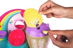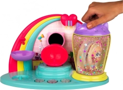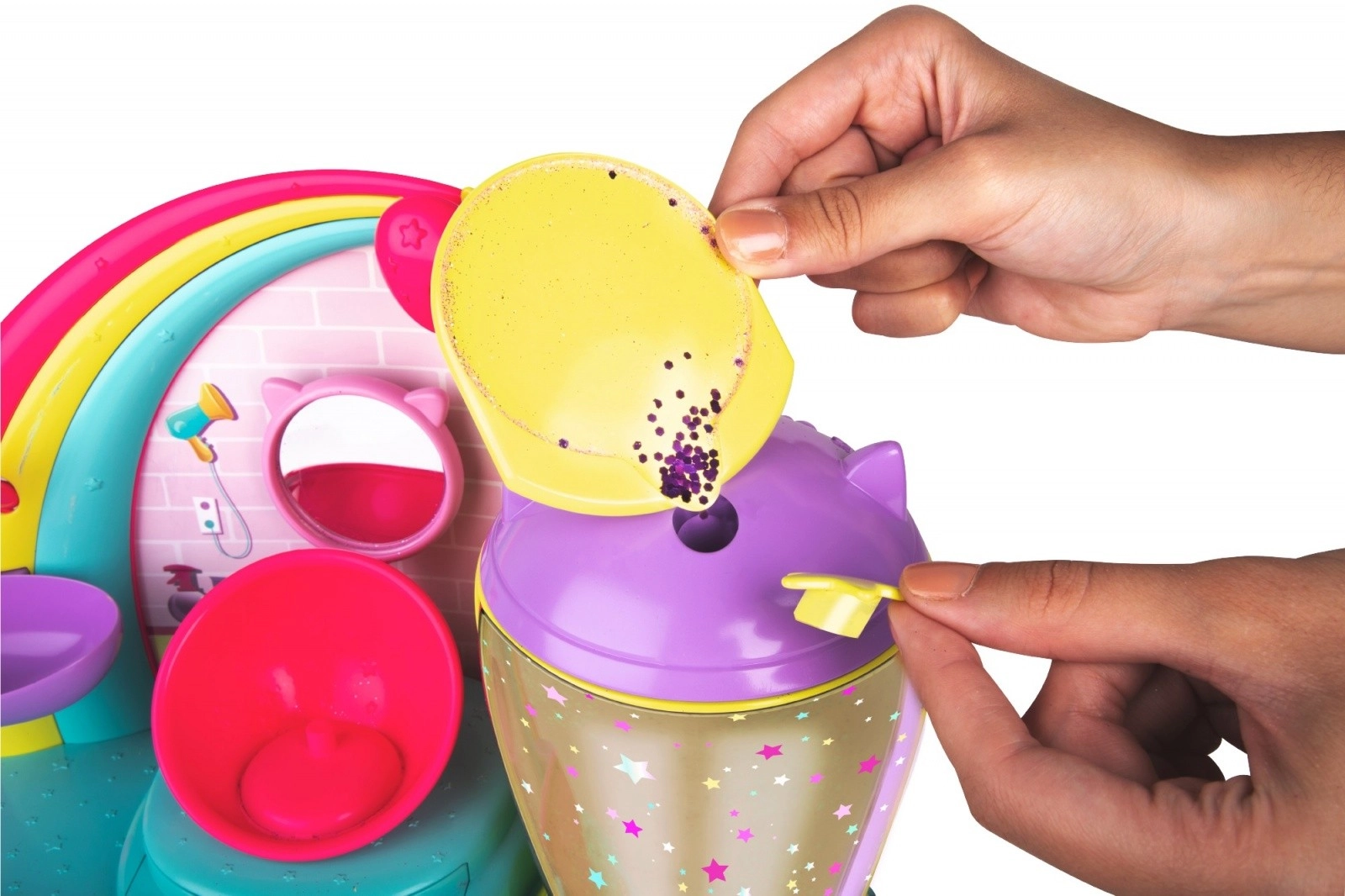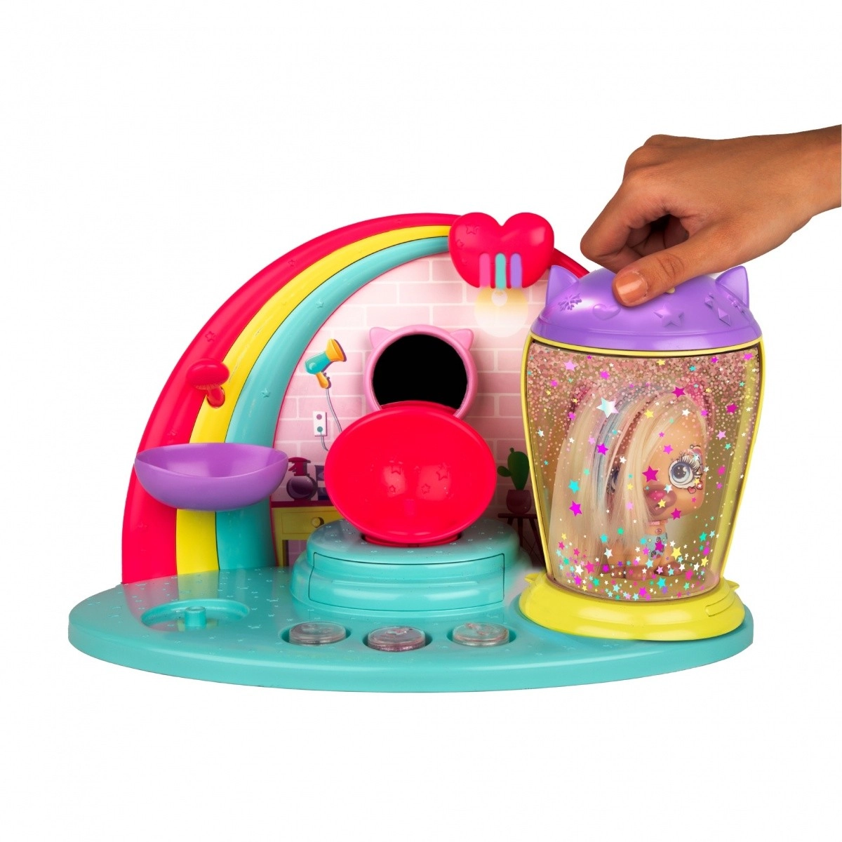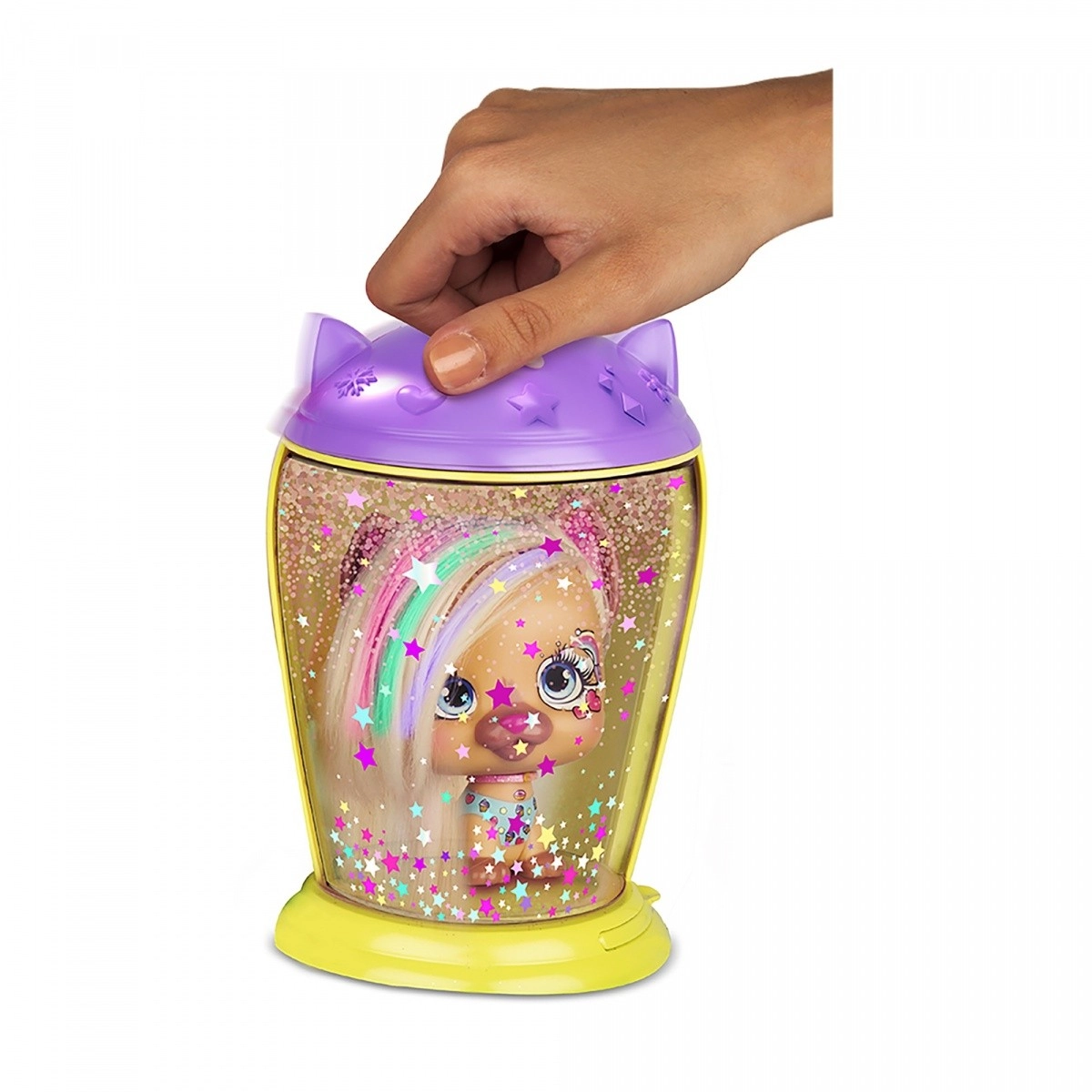 Posiziona la mini doll nella camera, attiva il coperchio e guarda come i capelli si illuminano di stelline e glitter.