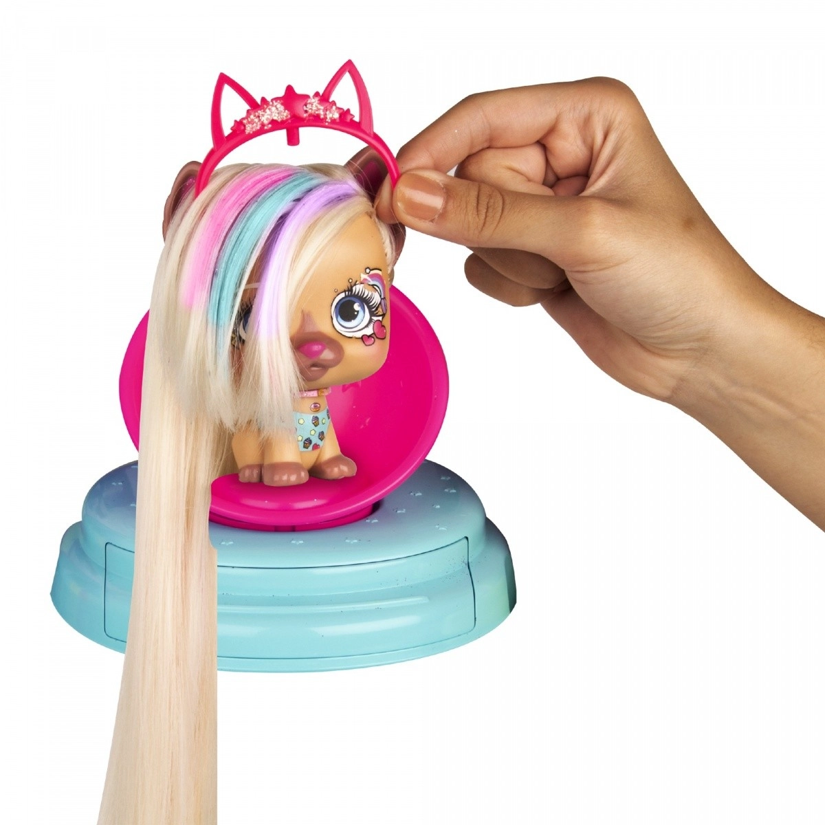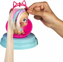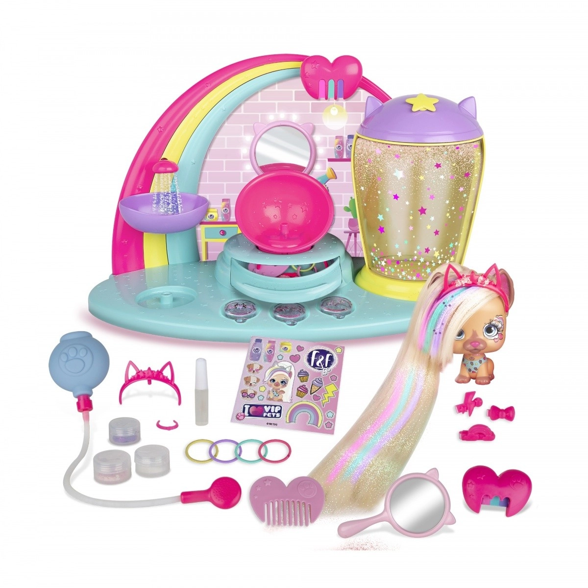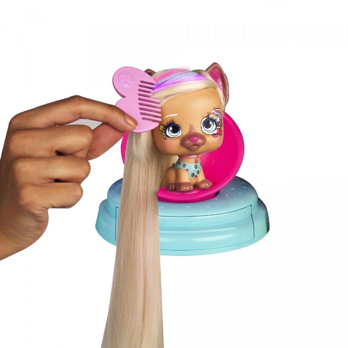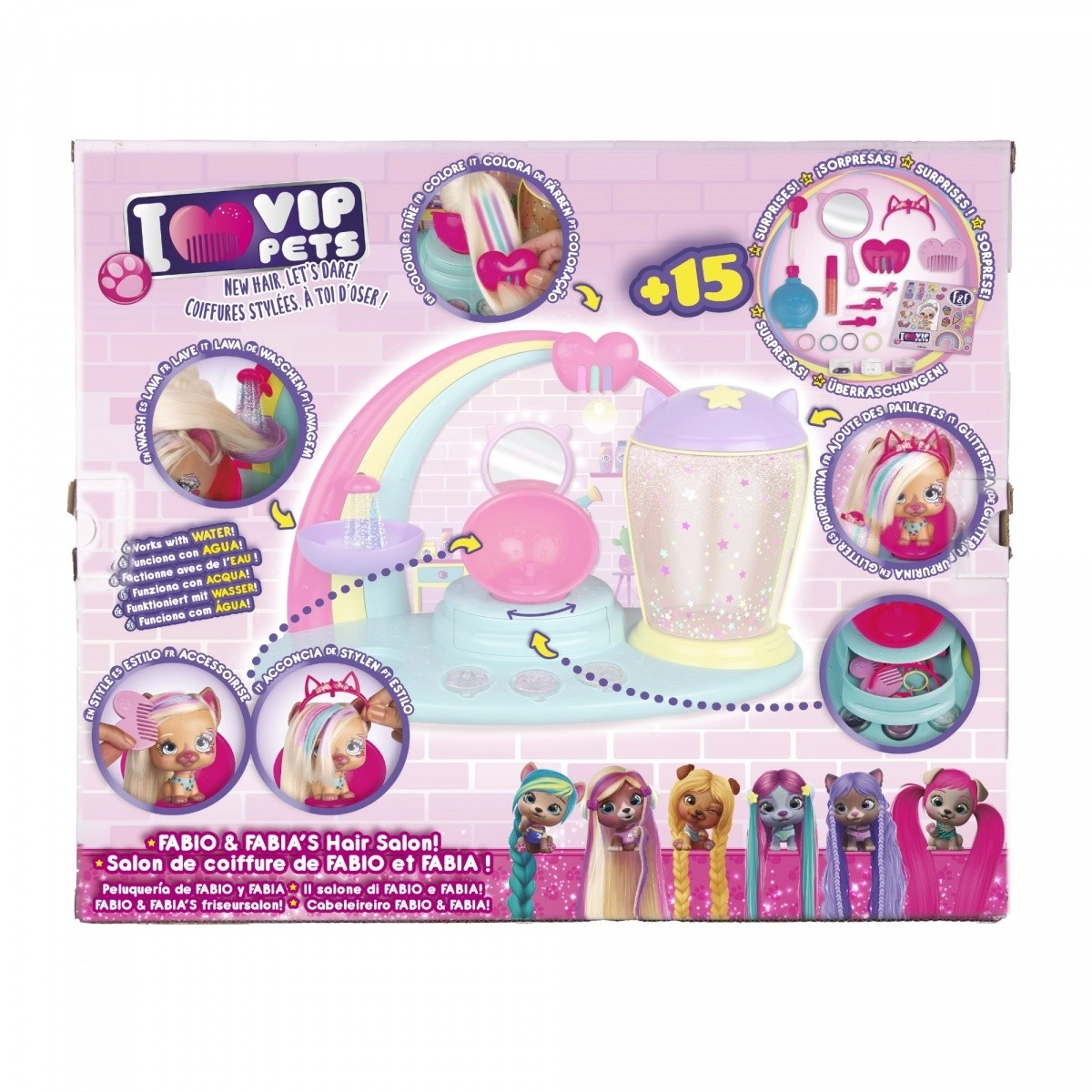 Il salone VIP Pets porta l’atmosfera della serie amata direttamente nella cameretta. La protagonista è la cagnolina Kiara con capelli biondo platino lunghi 30 cm, che puoi lavare, colorare, pettinare, intrecciare e decorare. Con il lavatesta funzionante inumidisci facilmente i capelli e con il pettine arcobaleno crei magiche ciocche colorate. Nella capsula glitter aggiungi un incantevole effetto scintillante all’acconciatura.