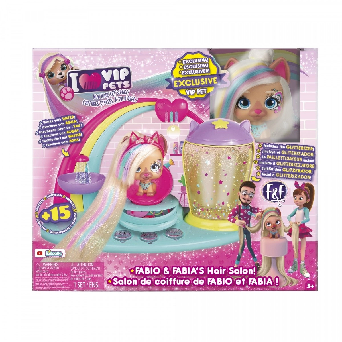 Crea a casa il tuo studio da parrucchiera con il salone VIP Pets e la dolcissima cagnolina Kiara con capelli extra lunghi da 30 cm. Pettina, intreccia, colora e decora con glitter: grazie al vero lavatesta, alla camera dei glitter e al ricco set di 15 accessori potrai realizzare decine di acconciature originali. Colori sicuri e atossici, lavorazione di qualità ed effetti colorati garantiscono ore di divertimento creativo per bambini dai 3 anni.