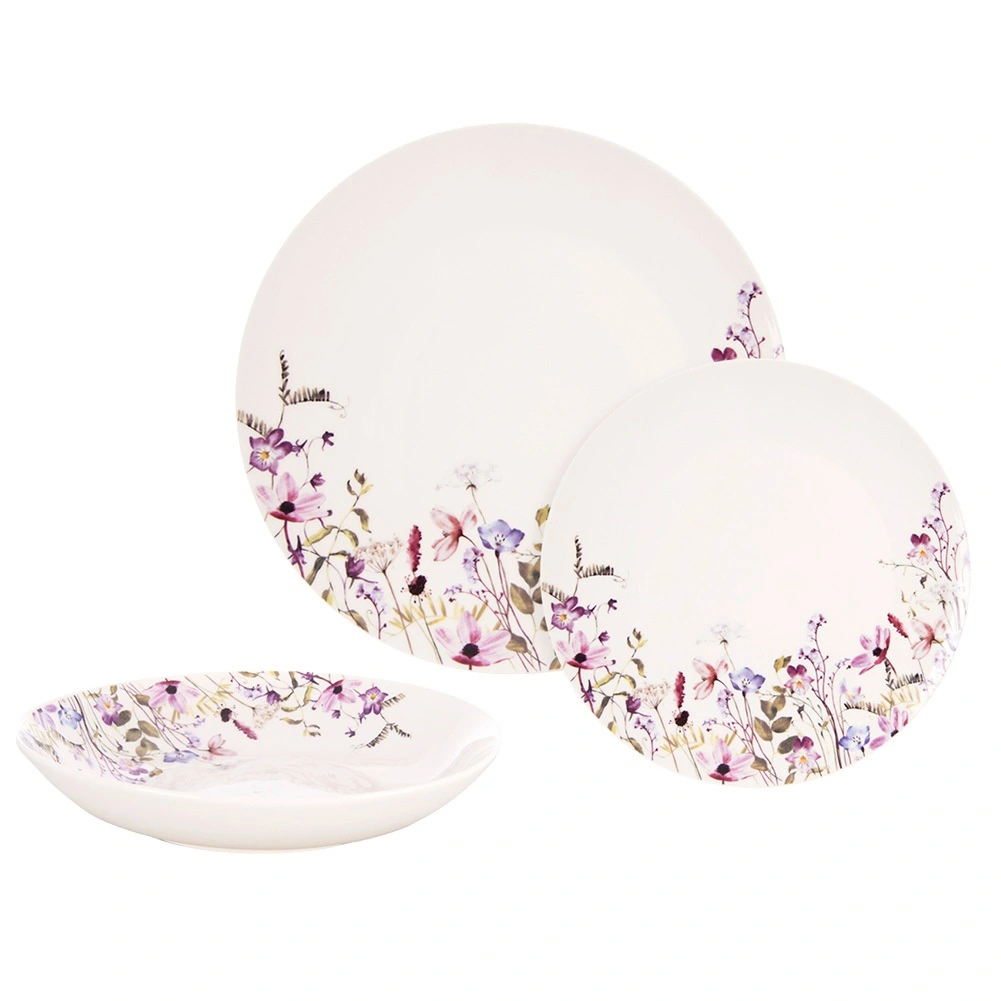 Elegante servizio da tavola in porcellana per 6 persone con delicato decoro floreale che impreziosisce ogni tavola. Include 18 pezzi: piatti fondi per zuppe e pasta, piatti piani grandi per il secondo e piattini da dessert. La porcellana con smalto bianco è adatta alla lavastoviglie e al microonde, ideale per l’uso quotidiano e per le occasioni speciali.