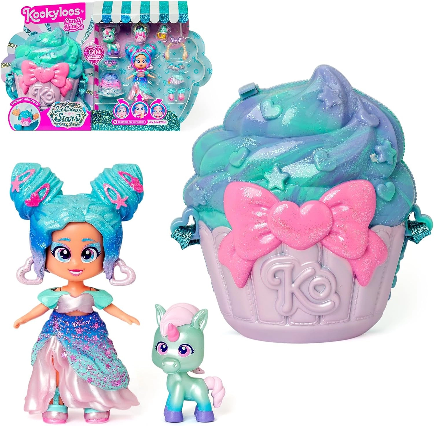 La figurina KookyLoos Candy Cream Stars porta una combinazione giocosa di stile e fantasia. I colori pastello, il tema di gelati e stelline e la possibilità di cambiare look stimolano l’immaginazione e la creatività dei bambini. Grazie alla pratica borsetta a forma di cupcake, i piccoli possono portare il loro personaggio preferito ovunque.