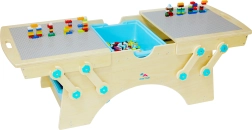 Tavolo da gioco in legno per bambini dai 3 anni con due superfici di gioco e ampi box contenitori, ideale per costruzioni creative. È compatibile con mattoncini LEGO, QMAN, SLUBAN, L-W e altri, ha un design sicuro con bordi arrotondati e una struttura resistente. Include anche un set di costruzione per giocare subito e istruzioni di montaggio dettagliate.